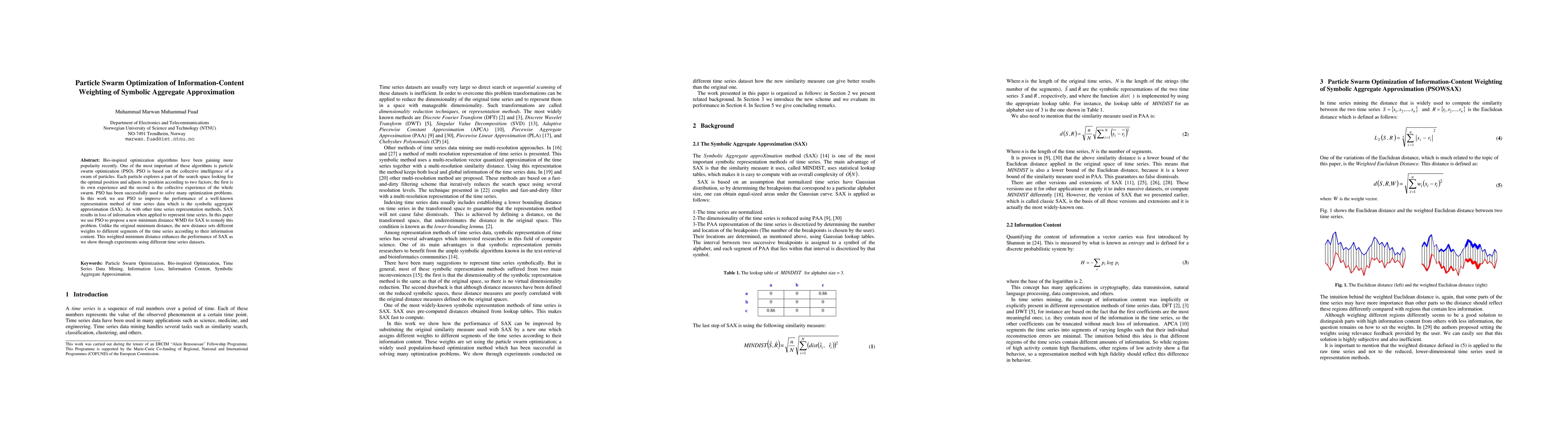 This paper uses Particle Swarm Optimization (PSO) to improve a time series representation method called Symbolic Aggregate Approximation (SAX), enhancing its performance by assigning different weights to segments based on their information content.