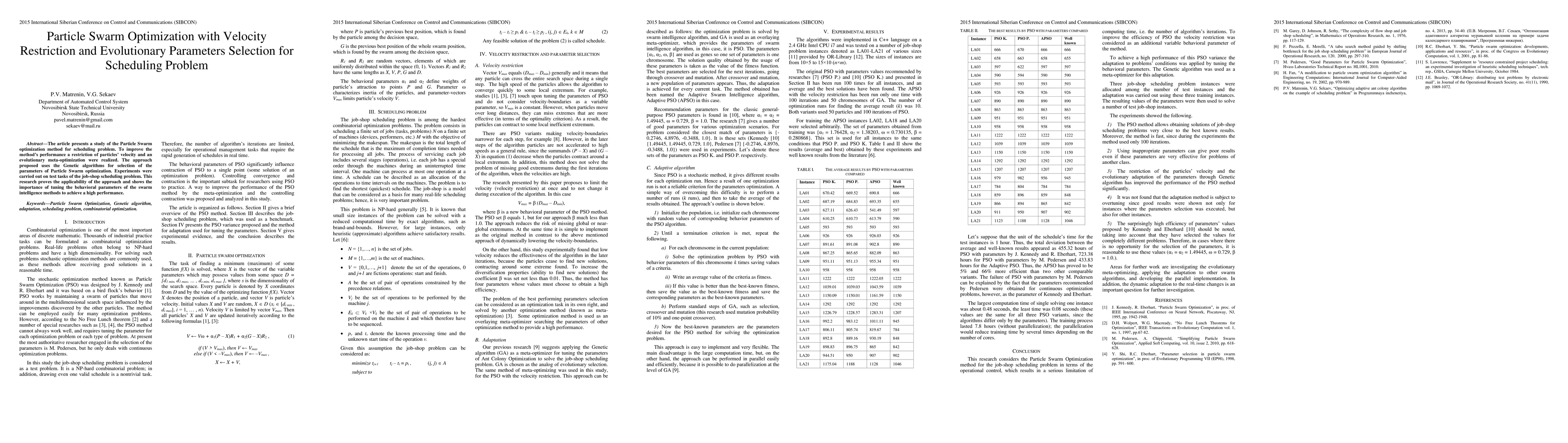 This paper explores enhanced Particle Swarm Optimization with velocity restriction and evolutionary parameter selection for job-shop scheduling. The study demonstrates improved performance through genetic algorithms for parameter tuning, showing the significance of optimizing swarm intelligence methods.