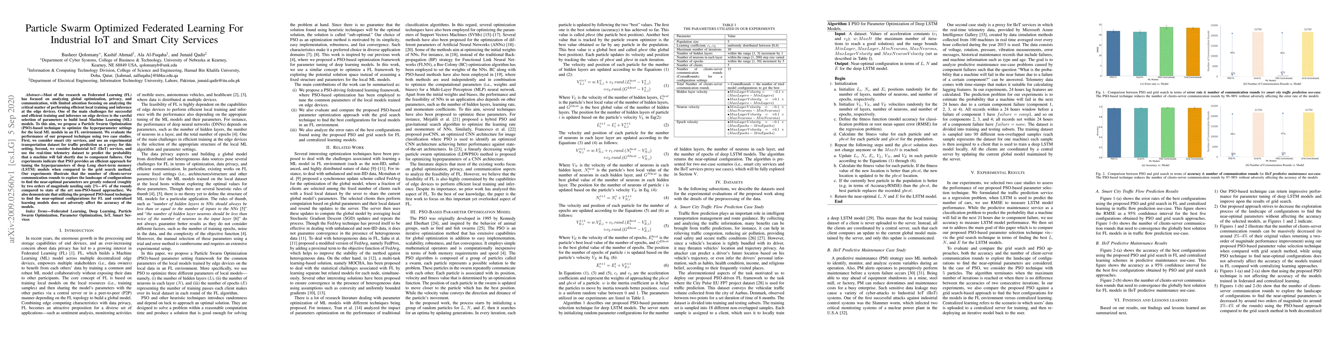 Most of the research on Federated Learning (FL) has focused on analyzing global optimization, privacy, and communication, with limited attention focusing on analyzing the critical matter of performing efficient local training and inference at the edge devices. One of the main challenges for successful and efficient training and inference on edge devices is the careful selection of parameters to build local Machine Learning (ML) models. To this aim, we propose a Particle Swarm Optimization (PSO)-based technique to optimize the hyperparameter settings for the local ML models in an FL environment. We evaluate the performance of our proposed technique using two case studies. First, we consider smart city services and use an experimental transportation dataset for traffic prediction as a proxy for this setting. Second, we consider Industrial IoT (IIoT) services and use the real-time telemetry dataset to predict the probability that a machine will fail shortly due to component failures. Our experiments indicate that PSO provides an efficient approach for tuning the hyperparameters of deep Long short-term memory (LSTM) models when compared to the grid search method. Our experiments illustrate that the number of clients-server communication rounds to explore the landscape of configurations to find the near-optimal parameters are greatly reduced (roughly by two orders of magnitude needing only 2%--4% of the rounds compared to state of the art non-PSO-based approaches). We also demonstrate that utilizing the proposed PSO-based technique to find the near-optimal configurations for FL and centralized learning models does not adversely affect the accuracy of the models.