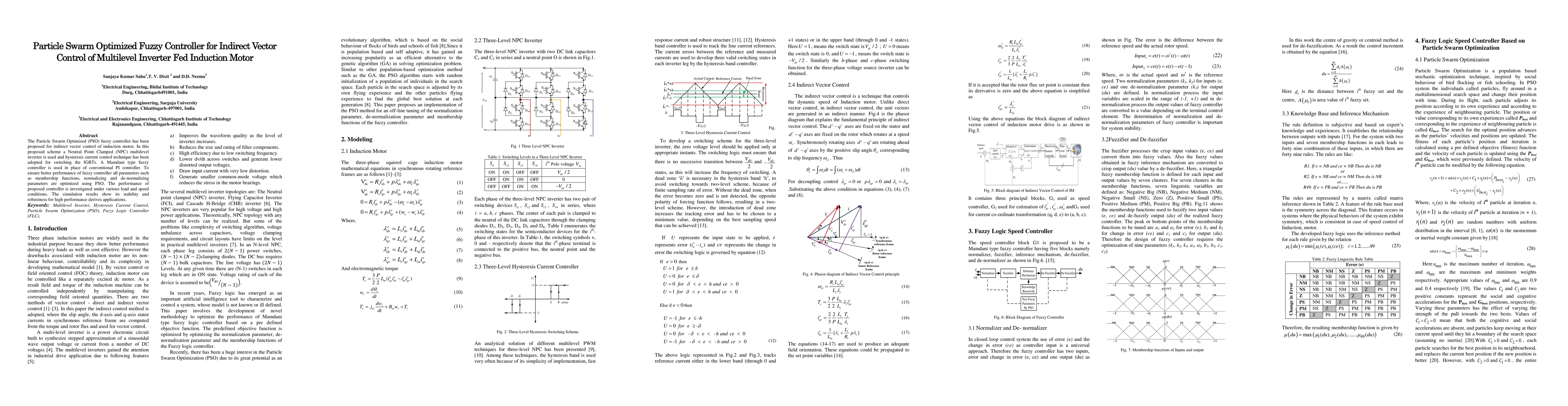 The paper proposes a Particle Swarm Optimized (PSO) fuzzy controller for indirect vector control of an induction motor driven by a Neutral Point Clamped (NPC) multilevel inverter. Simulation results demonstrate improved stability and robustness under varying load and speed conditions.
