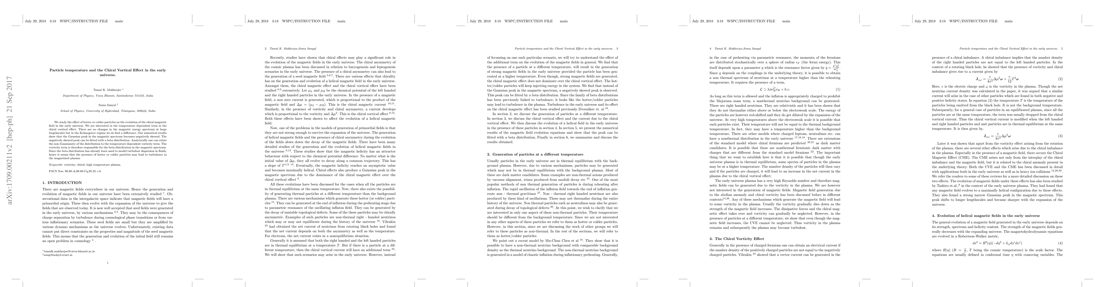 We study the effect of hotter or colder particles on the evolution of the chiral magnetic field in the early universe. We are interested in the temperature dependent term in the chiral vortical effect. There are no changes in the magnetic energy spectrum at large lengthscales but in the Kolmogorov regime we do find a difference. Our numerical results show that the Gaussian peak in the magnetic spectrum becomes negatively skewed. The negatively skewed peak can be fitted with a beta distribution. Analytically one can relate the non-Gaussianity of the distribution to the temperature dependent vorticity term. The vorticity term is therefore responsible for the beta distribution in the magnetic spectrum. Since the beta distribution has already been used to model turbulent dispersion in fluids, hence it seems that the presence of hotter or colder particles may lead to turbulence in the magnetized plasma.