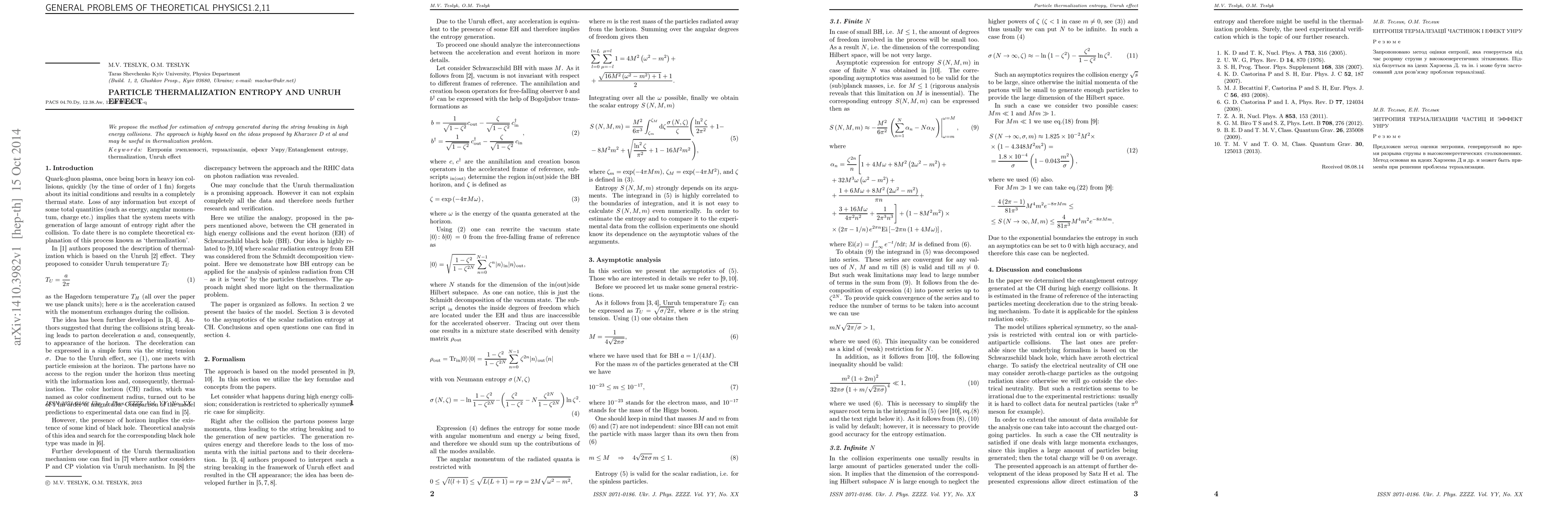 We propose the method for estimation of entropy generated during the string breaking in high energy collisions. The approach is highly based on the ideas proposed by Kharzeev D et al and may be useful in thermalization problem.