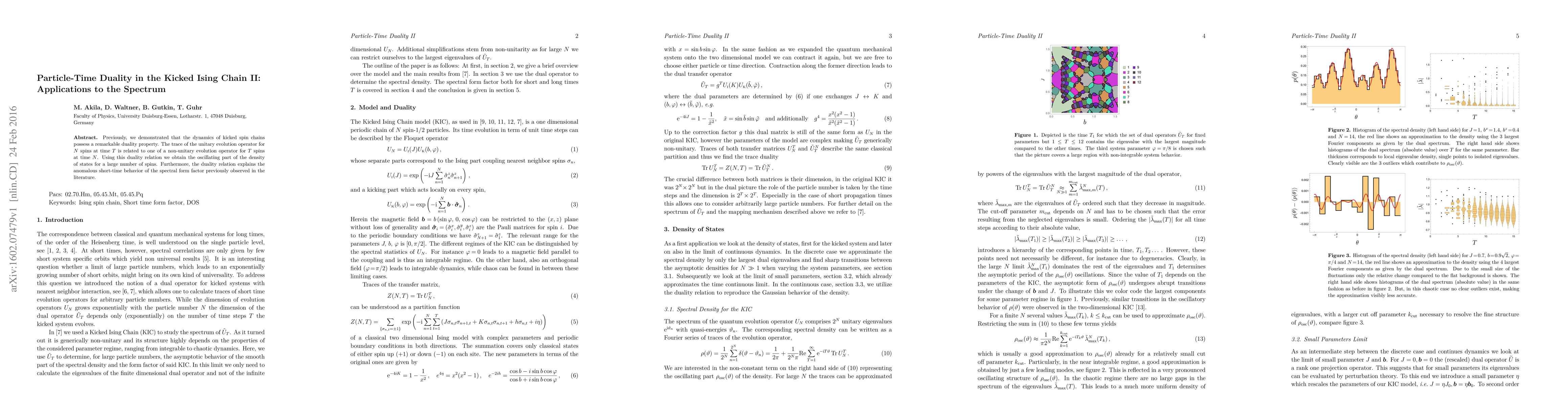This paper explores the particle-time duality in kicked spin chains, demonstrating that the dynamics exhibit a duality between unitary and non-unitary evolution operators. This duality is used to derive the oscillating part of the density of states for large spin chains and to explain the anomalous short-time behavior of the spectral form factor.