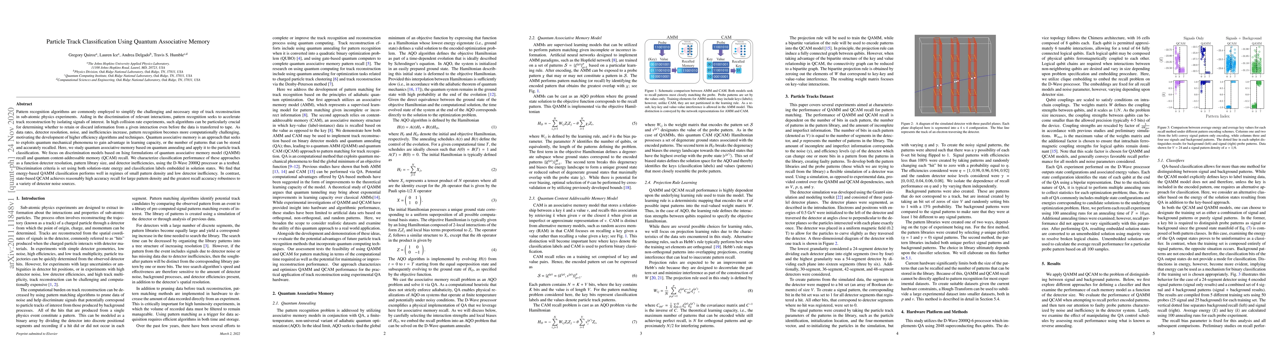 Pattern recognition algorithms are commonly employed to simplify the challenging and necessary step of track reconstruction in sub-atomic physics experiments. Aiding in the discrimination of relevant interactions, pattern recognition seeks to accelerate track reconstruction by isolating signals of interest. In high collision rate experiments, such algorithms can be particularly crucial for determining whether to retain or discard information from a given interaction even before the data is transferred to tape. As data rates, detector resolution, noise, and inefficiencies increase, pattern recognition becomes more computationally challenging, motivating the development of higher efficiency algorithms and techniques. Quantum associative memory is an approach that seeks to exploits quantum mechanical phenomena to gain advantage in learning capacity, or the number of patterns that can be stored and accurately recalled. Here, we study quantum associative memory based on quantum annealing and apply it to the particle track classification. We focus on discrimination models based on Ising formulations of quantum associative memory model (QAMM) recall and quantum content-addressable memory (QCAM) recall. We characterize classification performance of these approaches as a function detector resolution, pattern library size, and detector inefficiencies, using the D-Wave 2000Q processor as a testbed. Discrimination criteria is set using both solution-state energy and classification labels embedded in solution states. We find that energy-based QAMM classification performs well in regimes of small pattern density and low detector inefficiency. In contrast, state-based QCAM achieves reasonably high accuracy recall for large pattern density and the greatest recall accuracy robustness to a variety of detector noise sources.