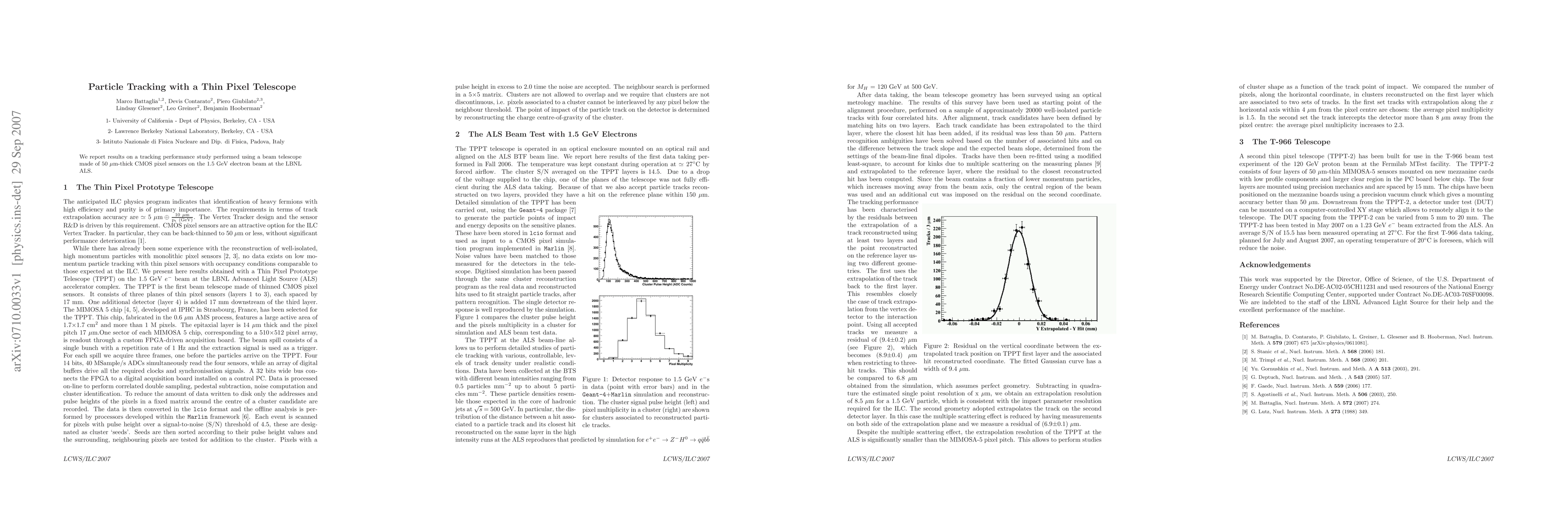 Summary: This study evaluates the tracking performance of a beam telescope constructed from 50 micron-thick CMOS pixel sensors, demonstrating its effectiveness in tracking particles in a 1.5 GeV electron beam environment at the LBNL ALS.