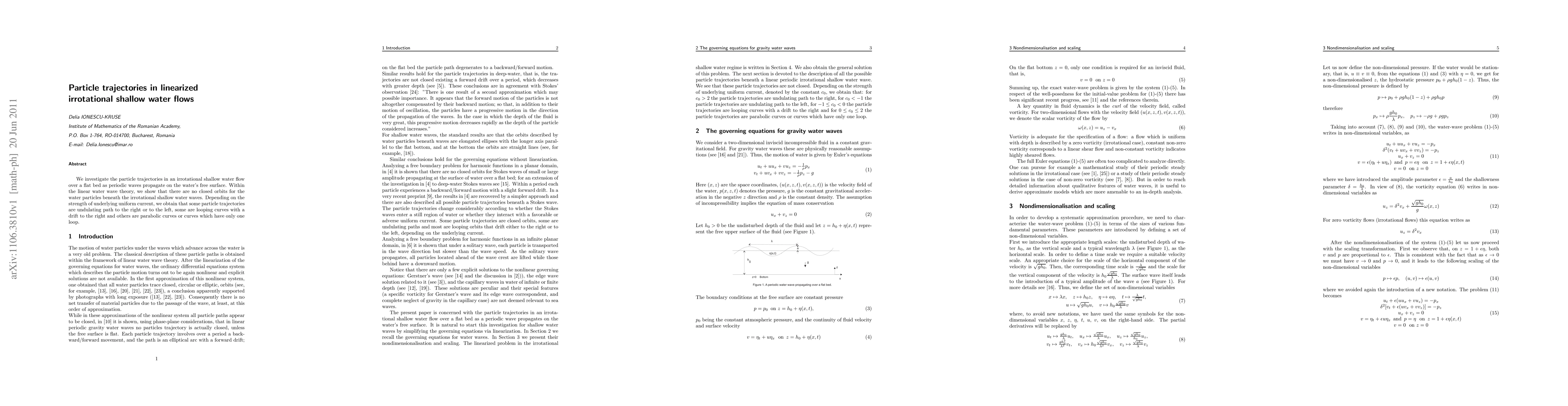 This study examines particle trajectories in irrotational shallow water flows under periodic wave conditions, revealing that no closed orbits exist beneath the waves. The trajectories vary depending on the strength of the underlying current, resulting in undulating, looping, parabolic, or single-loop paths.