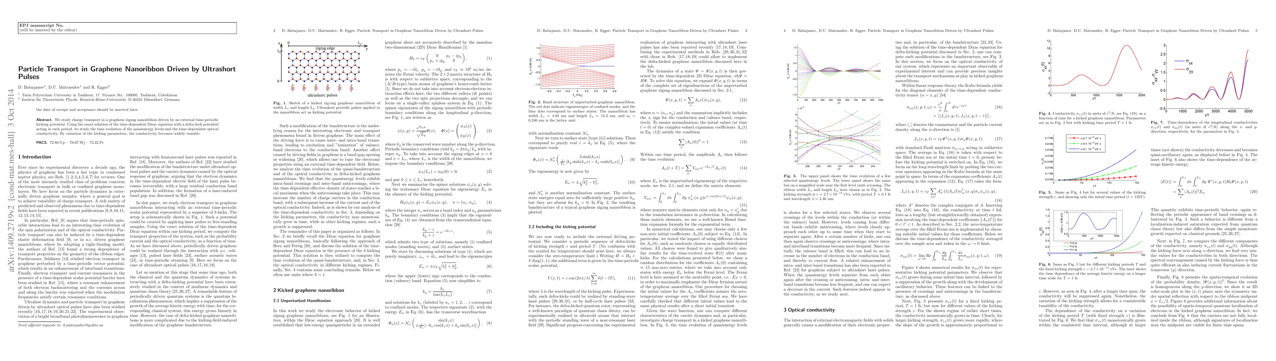 The research uses exact solutions of the time-dependent Dirac equation with a delta-kick potential in a graphene zigzag nanoribbon to study charge transport driven by ultrashort periodic pulses.