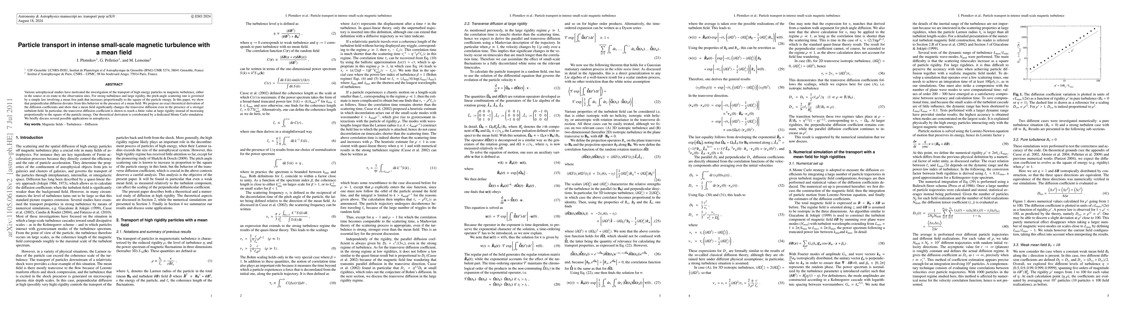 This paper reveals that intense small-scale magnetic turbulence with a mean field significantly alters particle transport, deviating from the typical square relationship between energy and diffusion rate.