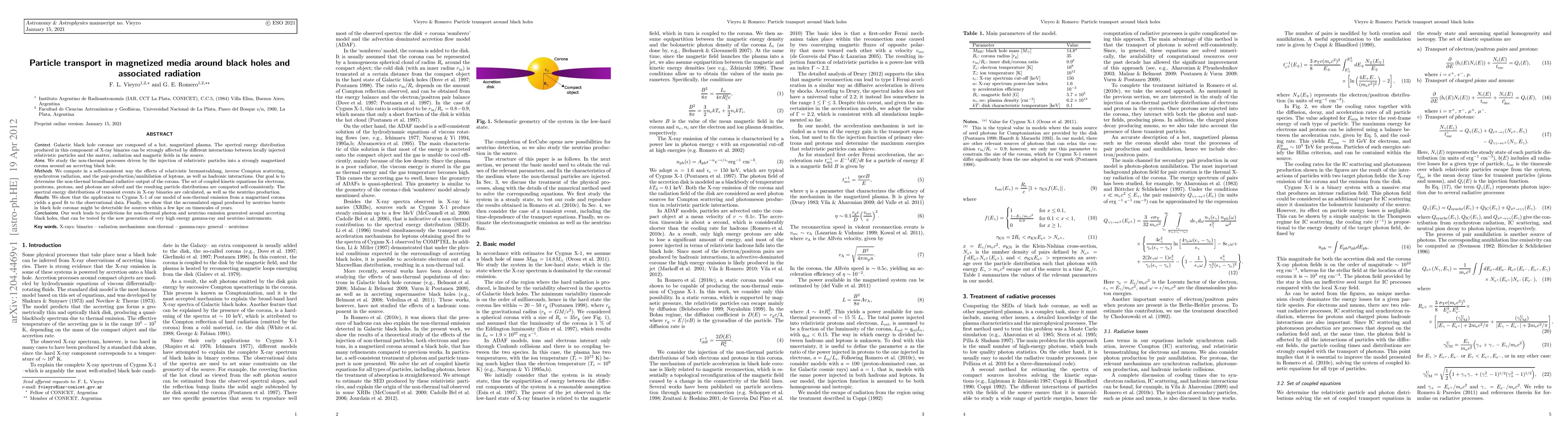 Galactic black hole coronae are composed of a hot, magnetized plasma. The spectral energy distribution produced in this component of X-ray binaries can be strongly affected by different interactions between locally injected relativistic particles and the matter, radiation and magnetic fields in the source. We study the non-thermal processes driven by the injection of relativistic particles into a strongly magnetized corona around an accreting black hole. We compute in a self-consistent way the effects of relativistic bremsstrahlung, inverse Compton scattering, synchrotron radiation, and the pair-production/annihilation of leptons, as well as hadronic interactions. Our goal is to determine the non-thermal broadband radiative output of the corona. The set of coupled kinetic equations for electrons, positrons, protons, and photons are solved and the resulting particle distributions are computed self-consistently. The spectral energy distributions of transient events in X-ray binaries are calculated, as well as the neutrino production. We show that the application to Cygnus X-1 of our model of non-thermal emission from a magnetized corona yields a good fit to the observational data. Finally, we show that the accumulated signal produced by neutrino bursts in black hole coronae might be detectable for sources within a few kpc on timescales of years. Our work leads to predictions for non-thermal photon and neutrino emission generated around accreting black holes, that can be tested by the new generation of very high energy gamma-ray and neutrino instruments.