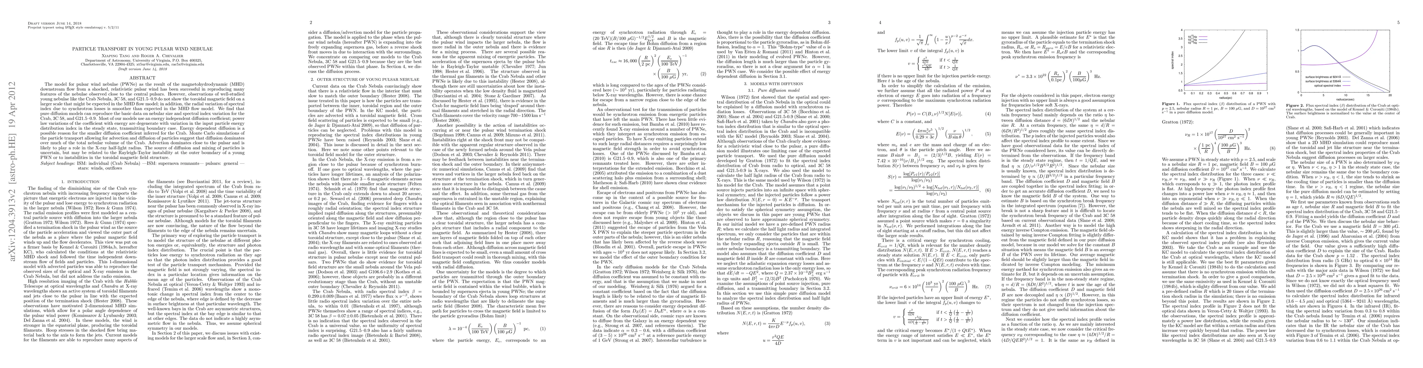This paper investigates particle transport in young pulsar wind nebulae, suggesting that pure diffusion models can better explain observed nebular sizes and spectral index variations compared to magnetohydrodynamic flow models. Advection and diffusion simulations indicate that diffusion dominates in the nebula's volume, while advection is significant near the pulsar. The source of diffusion remains uncertain but may involve instabilities at the nebula's outer boundary.