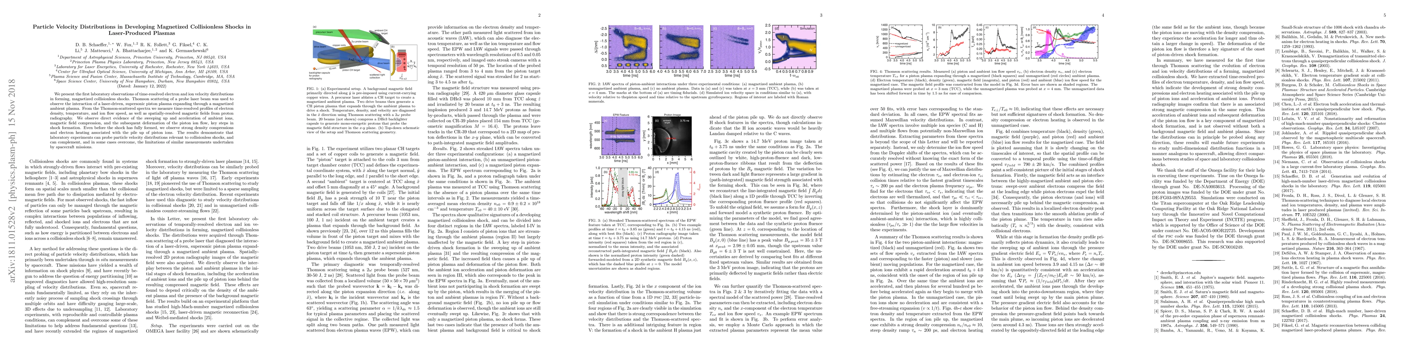 This paper reports laboratory observations of electron and ion velocity distributions in developing magnetized collisionless shocks using laser-produced plasmas. The study reveals the acceleration of ambient ions and magnetic field compression, providing insights into shock formation processes.