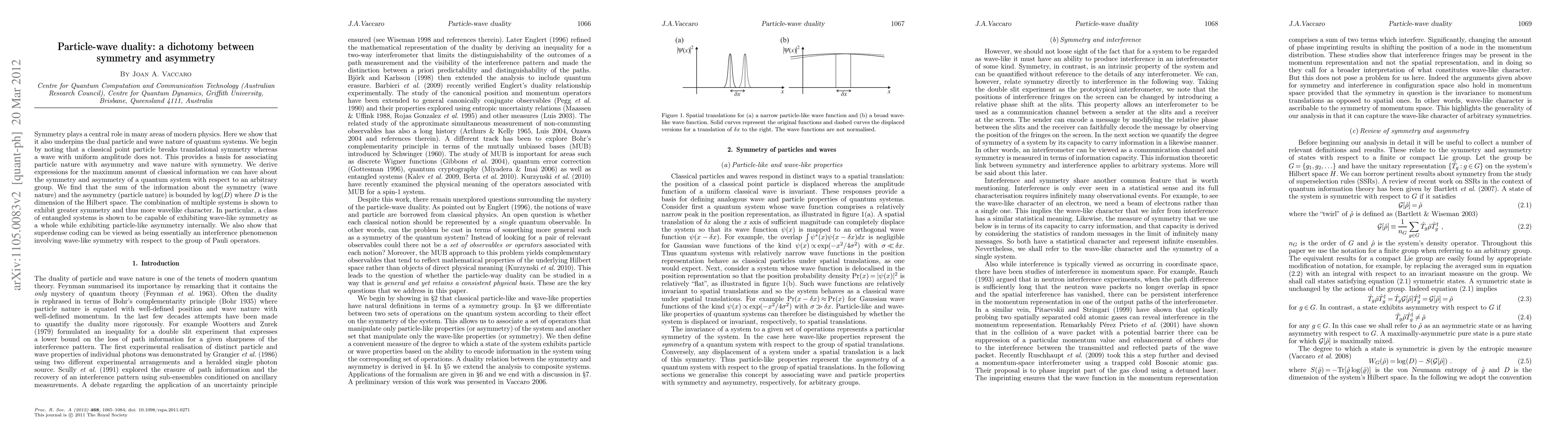 Symmetry plays a central role in many areas of modern physics. Here we show that it also underpins the dual particle and wave nature of quantum systems. We begin by noting that a classical point particle breaks translational symmetry whereas a wave with uniform amplitude does not. This provides a basis for associating particle nature with asymmetry and wave nature with symmetry. We derive expressions for the maximum amount of classical information we can have about the symmetry and asymmetry of a quantum system with respect to an arbitrary group. We find that the sum of the information about the symmetry (wave nature) and the asymmetry (particle nature) is bounded by log(D) where D is the dimension of the Hilbert space. The combination of multiple systems is shown to exhibit greater symmetry and thus more wavelike character. In particular, a class of entangled systems is shown to be capable of exhibiting wave-like symmetry as a whole while exhibiting particle-like asymmetry internally. We also show that superdense coding can be viewed as being essentially an interference phenomenon involving wave-like symmetry with respect to the group of Pauli operators.