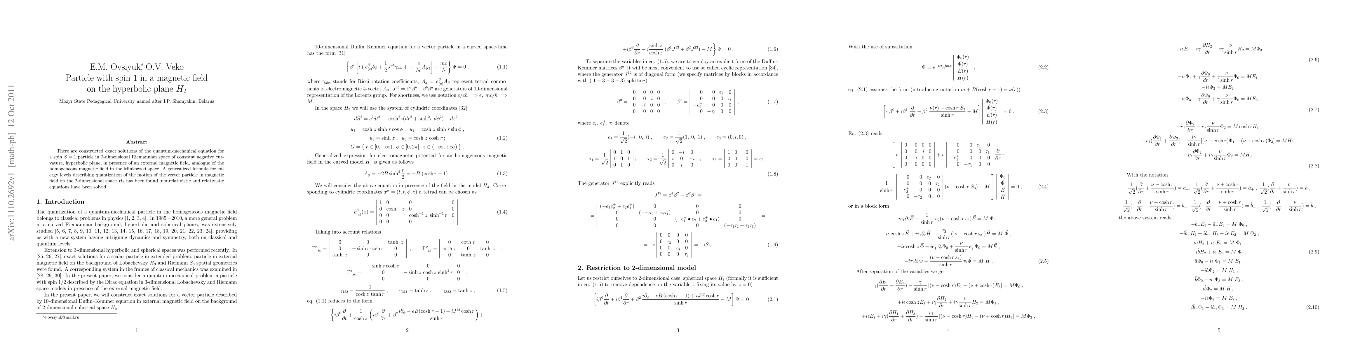 There are constructed exact solutions of the quantum-mechanical equation for a spin S=1 particle in 2-dimensional Riemannian space of constant negative curvature, hyperbolic plane, in presence of an external magnetic field, analogue of the homogeneous magnetic field in the Minkowski space. A generalized formula for energy levels describing quantization of the motion of the vector particle in magnetic field on the 2-dimensional space H_{2} has been found, nonrelativistic and relativistic equations have been solved.