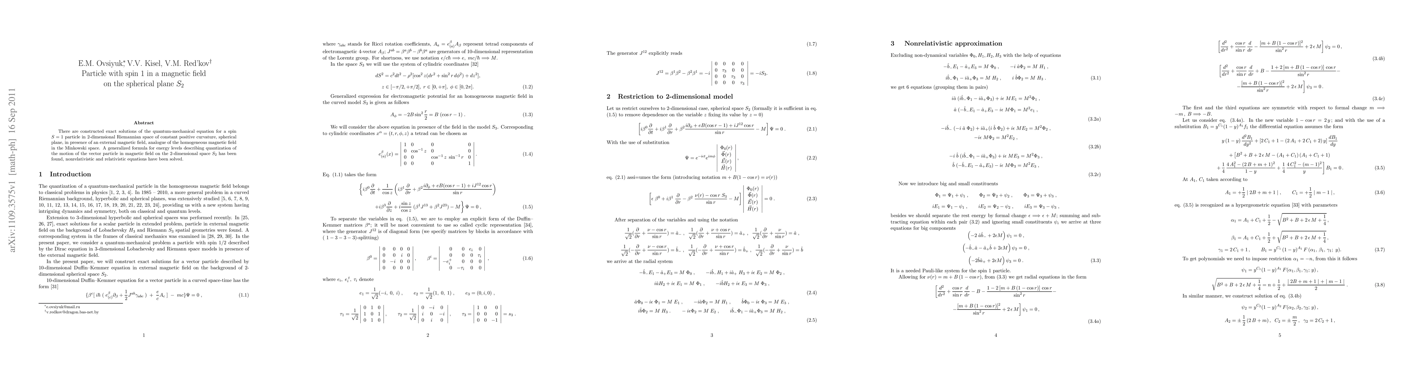 There are constructed exact solutions of the quantum-mechanical equation for a spin S=1 particle in 2-dimensional Riemannian space of constant positive curvature, spherical plane, in presence of an external magnetic field, analogue of the homogeneous magnetic field in the Minkowski space. A generalized formula for energy levels describing quantization of the motion of the vector particle in magnetic field on the 2-dimensional space S_{2} has been found, nonrelativistic and relativistic equations have been solved.