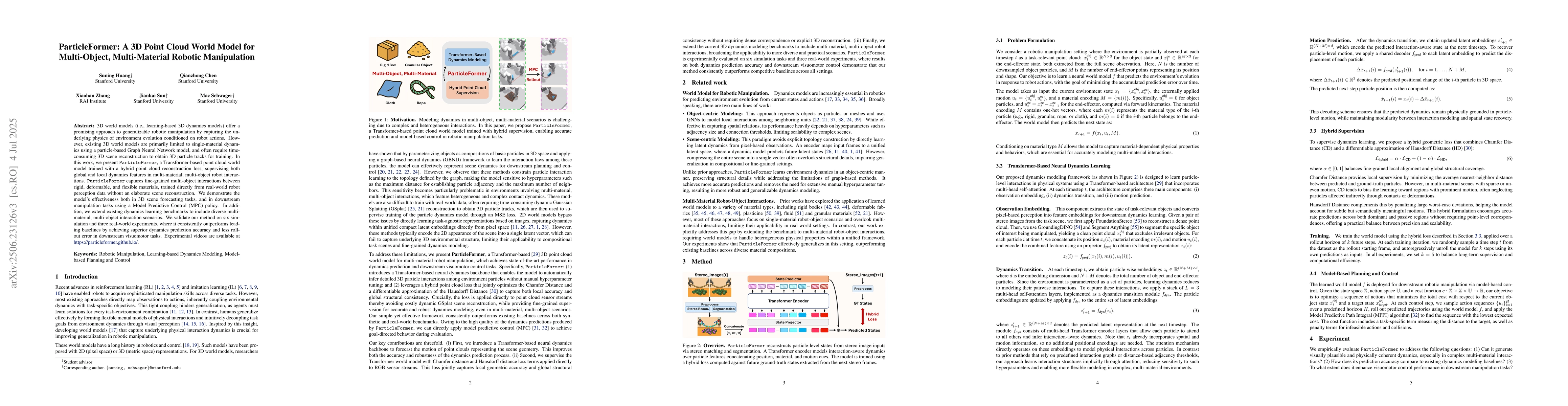 3D world models (i.e., learning-based 3D dynamics models) offer a promising approach to generalizable robotic manipulation by capturing the underlying physics of environment evolution conditioned on robot actions. However, existing 3D world models are primarily limited to single-material dynamics using a particle-based Graph Neural Network model, and often require time-consuming 3D scene reconstruction to obtain 3D particle tracks for training. In this work, we present ParticleFormer, a Transformer-based point cloud world model trained with a hybrid point cloud reconstruction loss, supervising both global and local dynamics features in multi-material, multi-object robot interactions. ParticleFormer captures fine-grained multi-object interactions between rigid, deformable, and flexible materials, trained directly from real-world robot perception data without an elaborate scene reconstruction. We demonstrate the model's effectiveness both in 3D scene forecasting tasks, and in downstream manipulation tasks using a Model Predictive Control (MPC) policy. In addition, we extend existing dynamics learning benchmarks to include diverse multi-material, multi-object interaction scenarios. We validate our method on six simulation and three real-world experiments, where it consistently outperforms leading baselines by achieving superior dynamics prediction accuracy and less rollout error in downstream visuomotor tasks. Experimental videos are available at https://particleformer.github.io/.