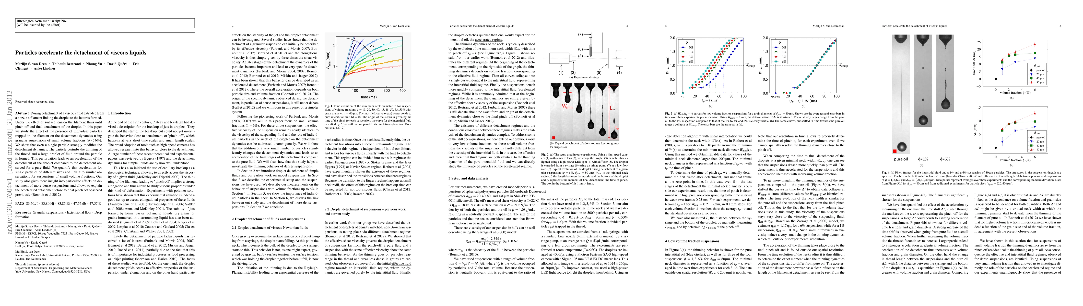 This paper investigates how particles within a filament linking a viscous droplet to a nozzle accelerate its detachment. Even a single particle significantly alters the thinning process, forming a larger droplet around it, leading to faster detachment compared to pure fluid. The study quantifies this acceleration for various particle sizes and provides insights into the detachment dynamics of dense suspensions.