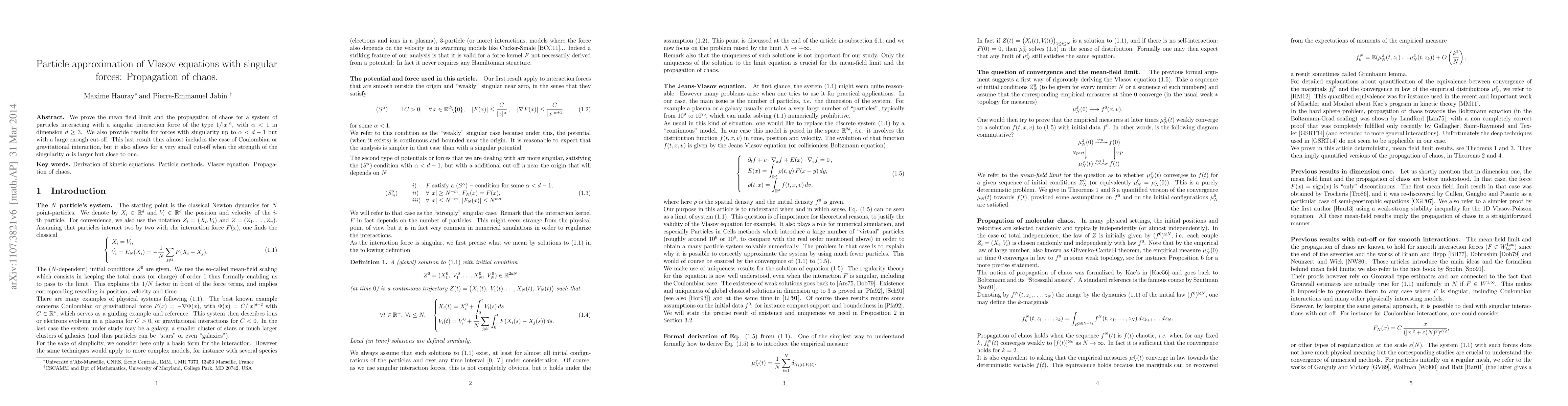We obtain the mean field limit and the propagation of chaos for a system of particles interacting with a singular interaction force of the type $1/|x|^\alpha$, with $\alpha <1$ in dimension $d \geq 3$. We also provide results for forces with singularity up to $\alpha < d-1$ but with large enough cut-off. This last result thus almost includes the most interesting case of Coulombian or gravitational interaction, but it is also interesting when the strength of the singularity $\alpha$ is larger but close to one, in which case it allows for very small cut-off.