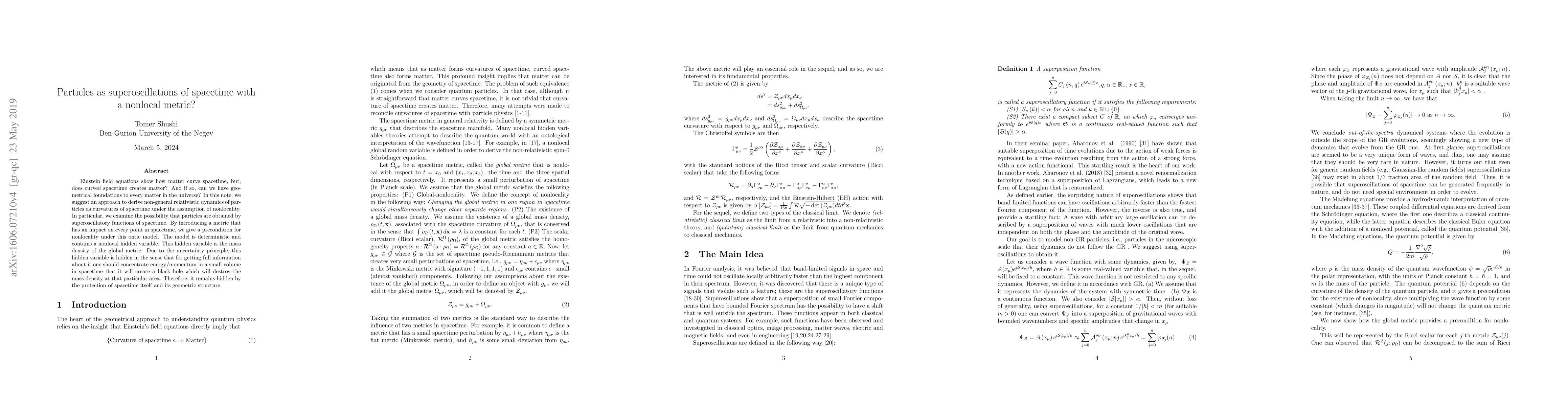 Einstein field equations show how matter curve spacetime, but, does curved spacetime creates matter? And if so, can we have geometrical foundations to every matter in the universe? In this note, we suggest an approach to derive non-general relativistic dynamics of particles as curvatures of spacetime under the assumption of nonlocality. In particular, we examine the possibility that particles are obtained by superoscillatory functions of spacetime. By introducing a metric that has an impact on every point in spacetime, we give a precondition for nonlocality under this ontic model. The model is deterministic and contains a nonlocal hidden variable. This hidden variable is the mass density of the global metric. Due to the uncertainty principle, this hidden variable is hidden in the sense that for getting full information about it one should concentrate energy/momentum in a small volume in spacetime that it will create a black hole which will destroy the mass-density at that particular area. Therefore, it remains hidden by the protection of spacetime itself and its geometric structure.