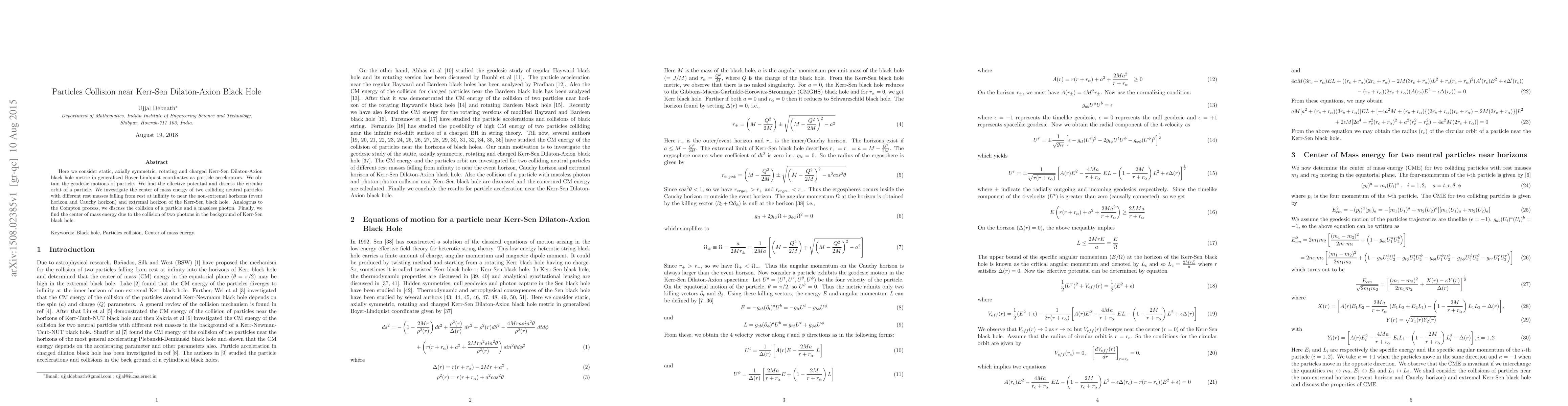 This study examines particle collisions near a Kerr-Sen Dilaton-Axion black hole, analyzing geodesic motions and effective potentials to determine the center of mass energy for colliding particles and photons, including scenarios analogous to the Compton process and photon-photon interactions.