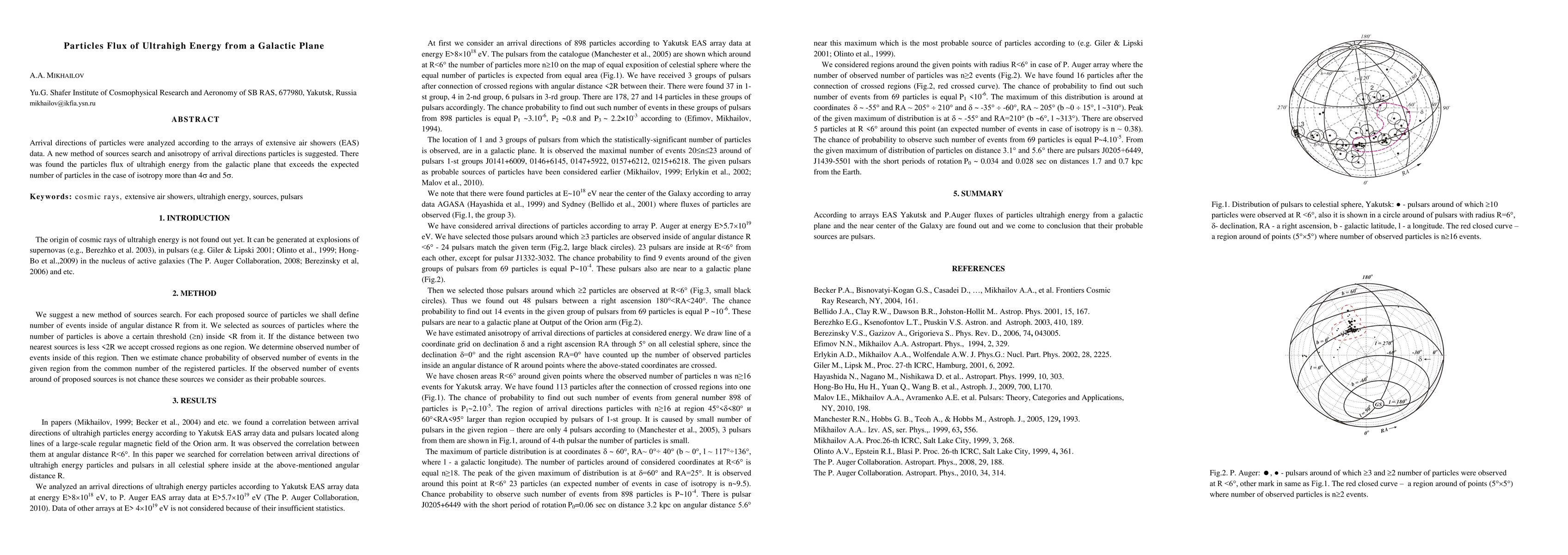 Arrival directions of particles were analyzed according to the arrays of extensive air showers (EAS) data. A new method of sources search and anisotropy of arrival directions particles is suggested. There was found the particles flux of ultrahigh energy from the galactic plane that exceeds the expected number of particles in the case of isotropy more than 4\sigma and 5\sigma.