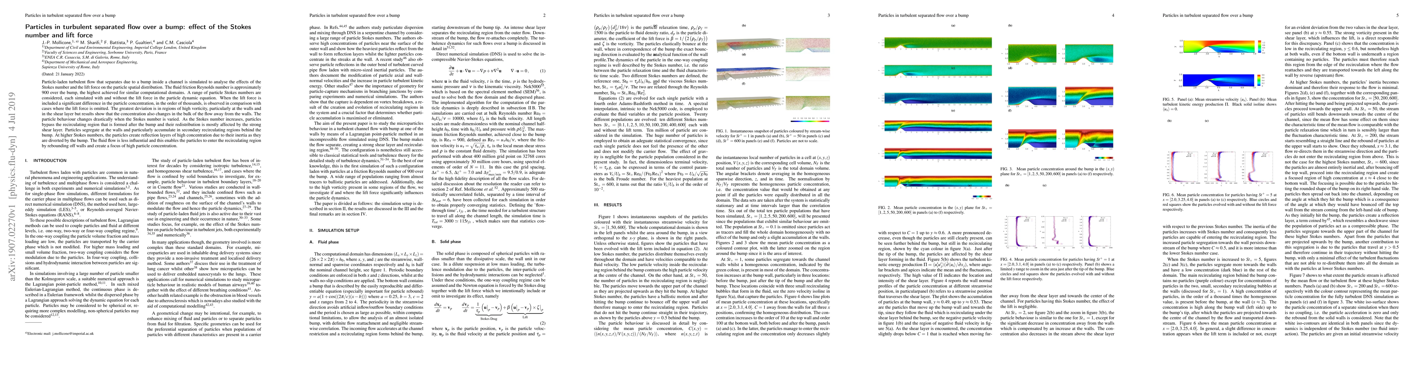 A study investigates how particles in turbulent flow behave when separated from a bump, with varying Stokes numbers and lift forces affecting particle distribution; high Stokes numbers lead to particle accumulation and reflection layers.