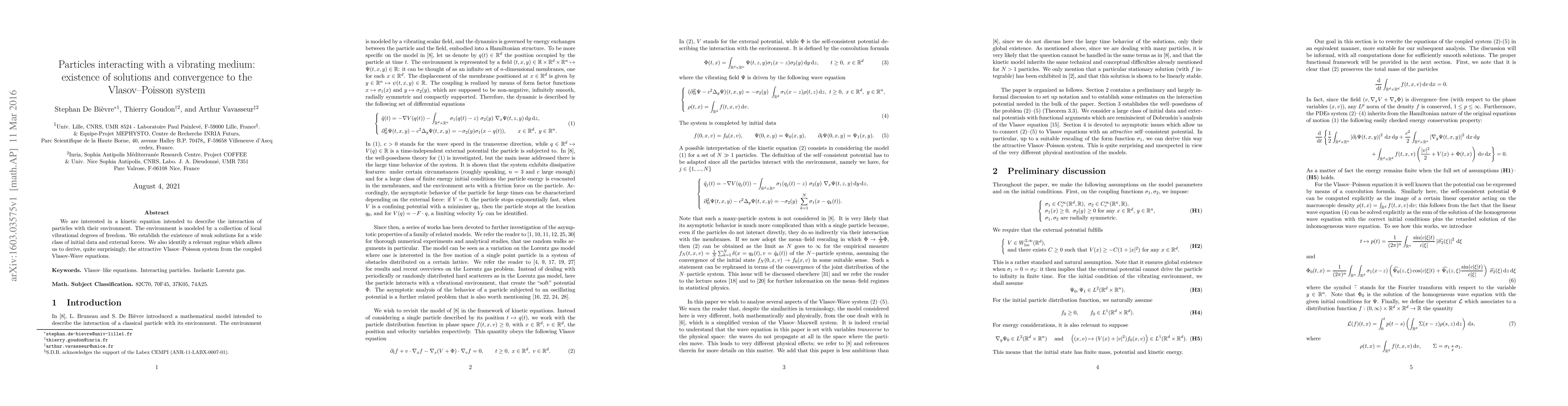 We are interested in a kinetic equation intended to describe the interaction of particles with their environment. The environment is modeled by a collection of local vibrational degrees of freedom. We establish the existence of weak solutions for a wide class of initial data and external forces. We also identify a relevant regime which allows us to derive, quite surprisingly, the attractive Vlasov--Poisson system from the coupled Vlasov-Wave equations.
