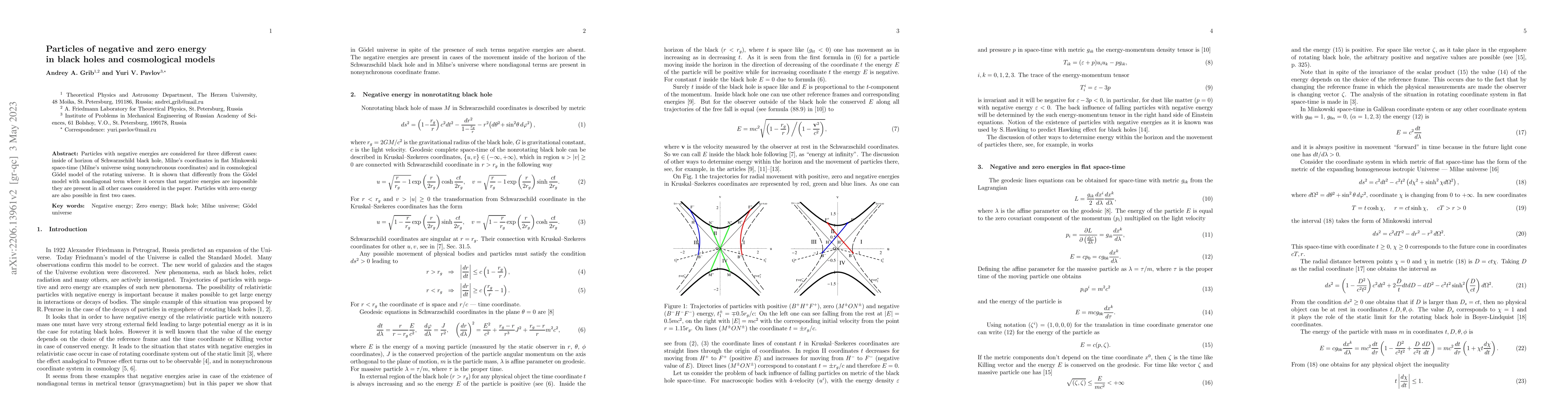 Summary: This paper explores the existence of negative and zero energy particles in three scenarios: within a Schwarzschild black hole, in Milne's coordinates of flat Minkowski space-time, and in the Gödel cosmological model. Negative energy particles are found in the first two cases but not in the Gödel model with a nondiagonal term, while zero energy particles are possible in the first two scenarios.