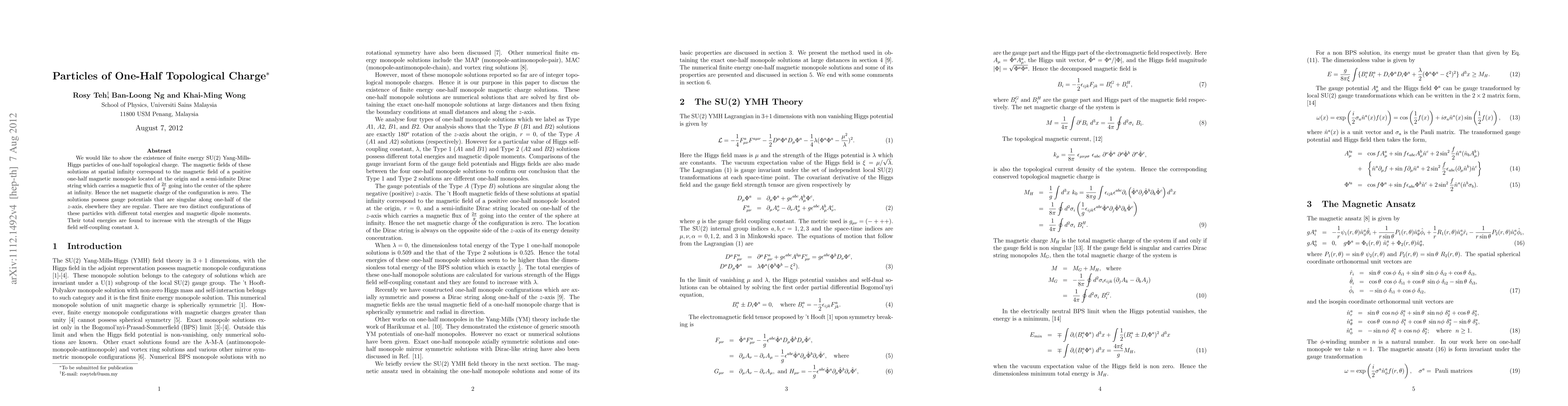 This paper explores the existence of finite energy SU(2) Yang-Mills-Higgs particles with one-half topological charge, characterized by magnetic fields resembling a positive one-half magnetic monopole and a semi-infinite Dirac string, resulting in a net magnetic charge of zero. The configurations exhibit different energies and magnetic dipole moments, with energy increasing with the Higgs field self-coupling constant.