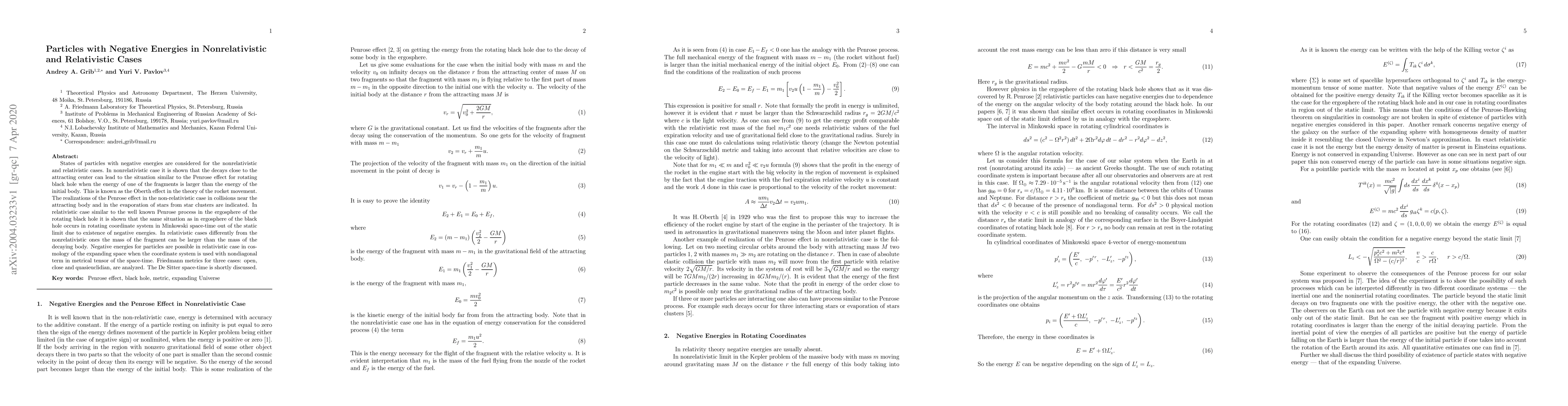States of particles with negative energies are considered for the nonrelativistic and relativistic cases. In nonrelativistic case it is shown that the decays close to the attracting center can lead to the situation similar to the Penrose effect for rotating black hole when the energy of one of the fragments is larger than the energy of the initial body. This is known as the Oberth effect in the theory of the rocket movement. The realizations of the Penrose effect in the non-relativistic case in collisions near the attracting body and in the evaporation of stars from star clusters are indicated. In relativistic case similar to the well known Penrose process in the ergosphere of the rotating black hole it is shown that the same situation as in ergosphere of the black hole occurs in rotating coordinate system in Minkowski space-time out of the static limit due to existence of negative energies. In relativistic cases differently from the nonrelativistic ones the mass of the fragment can be larger than the mass of the decaying body. Negative energies for particles are possible in relativistic case in cosmology of the expanding space when the coordinate system is used with nondiagonal term in metrical tensor of the space-time. Friedmann metrics for three cases: open, close and quasieuclidian, are analyzed. The De Sitter space-time is shortly discussed.