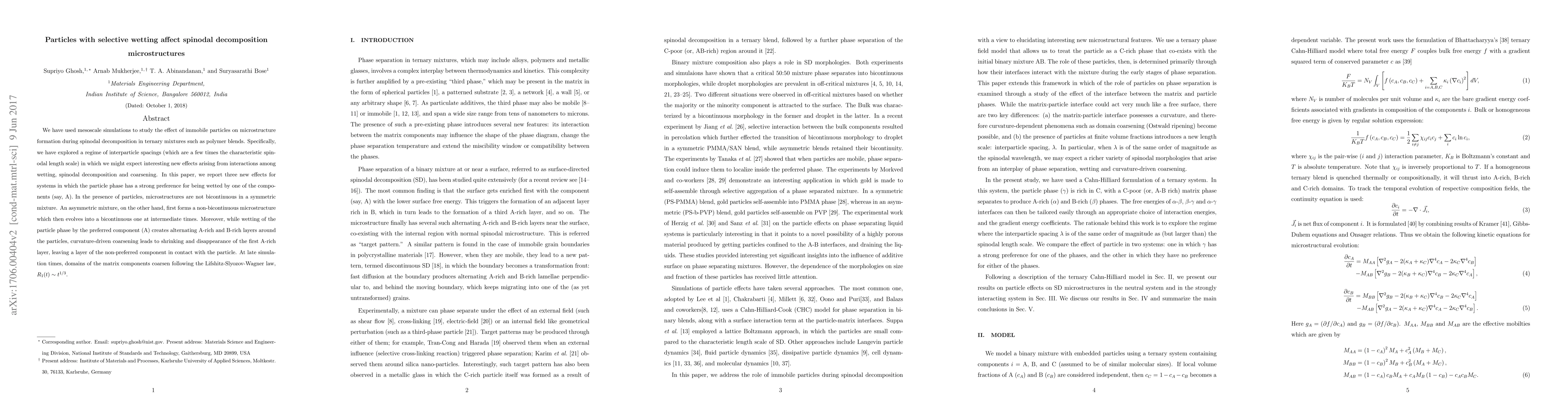 The paper presents a detailed analysis of spinodal decomposition microstructures in ternary mixtures with immobile particles, highlighting new effects arising from the interplay of wetting, spinodal decomposition, and coarsening.
