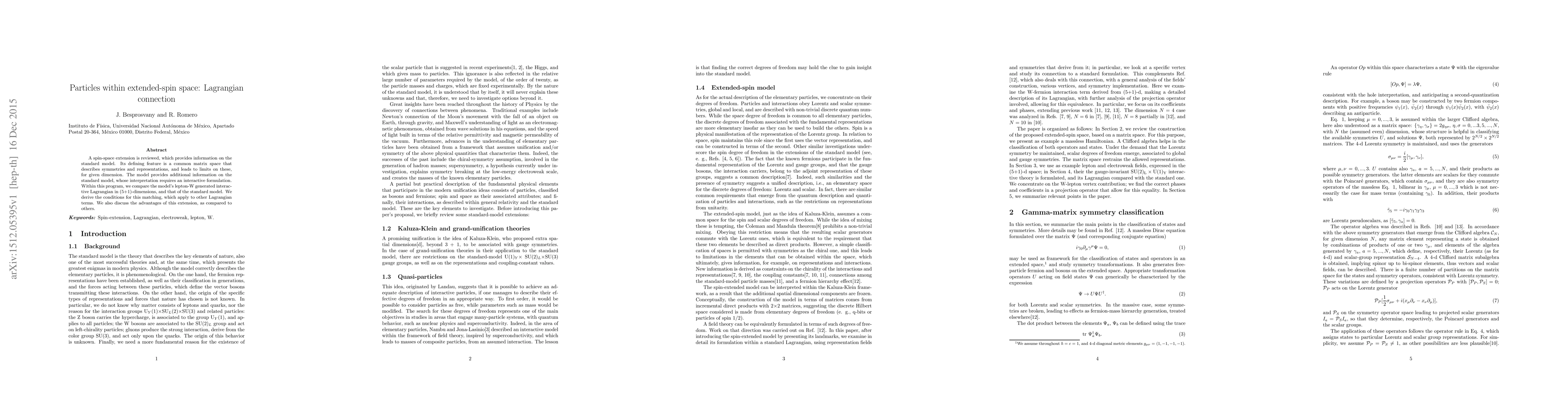 A spin-space extension is reviewed, which provides information on the standard model. Its defining feature is a common matrix space that describes symmetries and representations, and leads to limits on these, for given dimension. The model provides additional information on the standard model, whose interpretation requires an interactive formulation. Within this program, we compare the model's lepton-W generated interactive Lagrangian in (5+1)-dimensions, and that of the standard model. We derive the conditions for this matching, which apply to other Lagrangian terms. We also discuss the advantages of this extension, as compared to others.