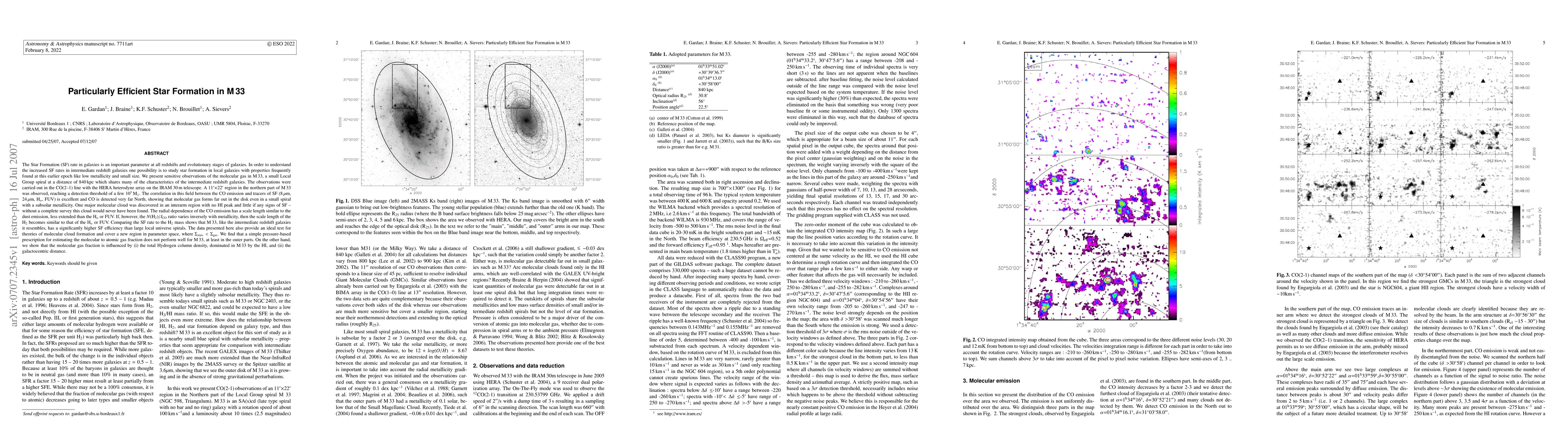 The Star Formation (SF) rate in galaxies is an important parameter at all redshifts and evolutionary stages of galaxies. In order to understand the increased SF rates in intermediate redshift galaxies one possibility is to study star formation in local galaxies with properties frequently found at this earlier epoch like low metallicity and small size. We present sensitive observations of the molecular gas in M 33, a small Local Group spiral at a distance of 840 kpc which shares many of the characteristics of the intermediate redshift galaxies. The observations were carried out in the CO(2--1) line with the HERA heterodyne array on the IRAM 30 m telescope. A 11\arcmin$\times$22\arcmin region in the northern part of M 33 was observed, reaching a detection threshold of a few 10$^{3}$ \msol. The correlation in this field between the CO emission and tracers of SF (8\mum, 24\mum, \Ha, FUV) is excellent and CO is detected very far North, showing that molecular gas forms far out in the disk even in a small spiral with a subsolar metallicity. One major molecular cloud was discovered in an interarm region with no HI peak and little if any signs of SF -- without a complete survey this cloud would never have been found. The radial dependence of the CO emission has a scale length similar to the dust emission, less extended than the \Ha or FUV. If, however, the $\ratioo$ ratio varies inversely with metallicity, then the scale length of the H$_2$ becomes similar to that of the \Ha or FUV. Comparing the SF rate to the H$_2$ mass shows that M 33, like the intermediate redshift galaxies it resembles, has a significantly higher SF efficiency than large local universe spirals.