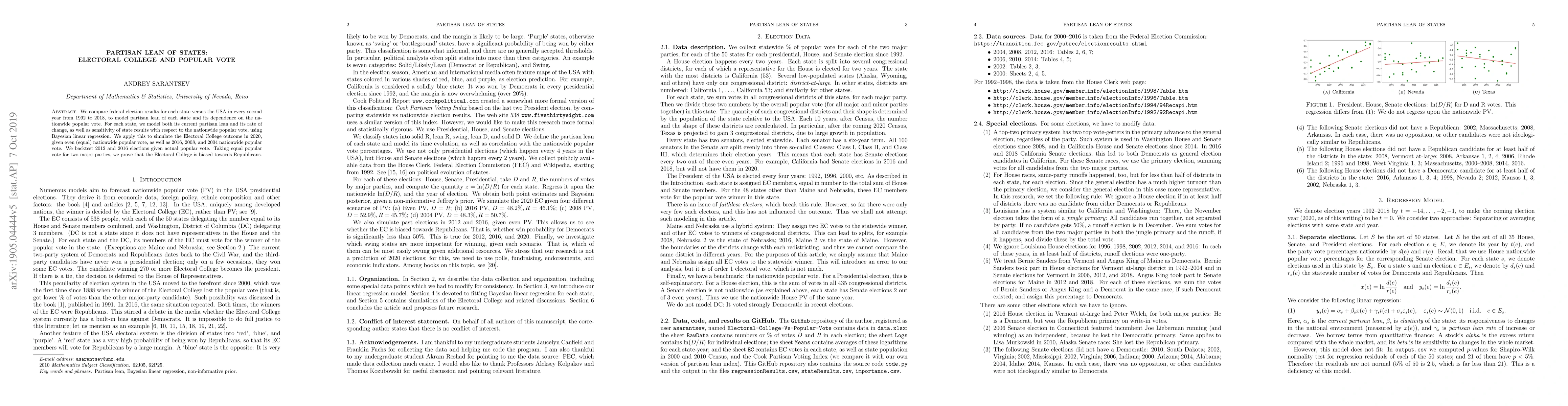 We compare federal election results for each state versus the USA in every second year from 1992 to 2018, to model partisan lean of each state and its dependence on the nationwide popular vote. For each state, we model both its current partisan lean and its rate of change, as well as sensitivity of state results with respect to the nationwide popular vote, using Bayesian linear regression. We apply this to simulate the Electoral College outcome in 2020, given even (equal) nationwide popular vote, as well as 2016, 2008, and 2004 nationwide popular vote. We backtest 2012 and 2016 elections given actual popular vote. Taking equal popular vote for two major parties, we prove that the Electoral College is biased towards Republicans.