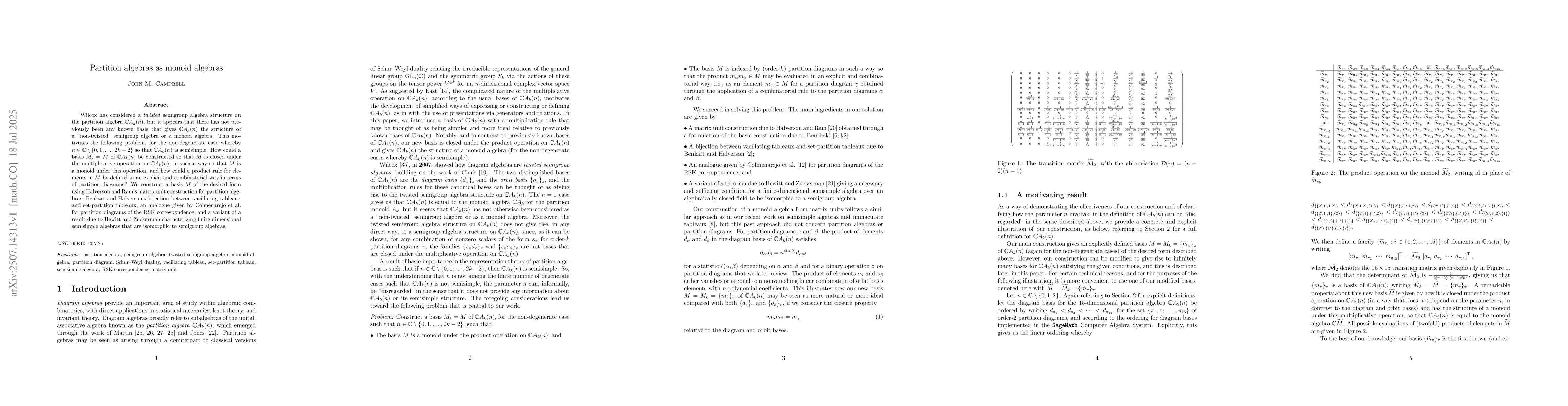Wilcox has considered a twisted semigroup algebra structure on the partition algebra $\mathbb{C}A_k(n)$, but it appears that there has not previously been any known basis that gives $\mathbb{C}A_k(n)$ the structure of a "non-twisted" semigroup algebra or a monoid algebra. This motivates the following problem, for the non-degenerate case whereby $n \in \mathbb{C} \setminus \{ 0, 1, \ldots, 2 k - 2 \}$ so that $ \mathbb{C}A_k(n)$ is semisimple. How could a basis $M_{k} = M$ of $ \mathbb{C}A_k(n)$ be constructed so that $M$ is closed under the multiplicative operation on $\mathbb{C}A_k(n)$, in such a way so that $M$ is a monoid under this operation, and how could a product rule for elements in $M$ be defined in an explicit and combinatorial way in terms of partition diagrams? We construct a basis $M$ of the desired form using Halverson and Ram's matrix unit construction for partition algebras, Benkart and Halverson's bijection between vacillating tableaux and set-partition tableaux, an analogue given by Colmenarejo et al. for partition diagrams of the RSK correspondence, and a variant of a result due to Hewitt and Zuckerman characterizing finite-dimensional semisimple algebras that are isomorphic to semigroup algebras.