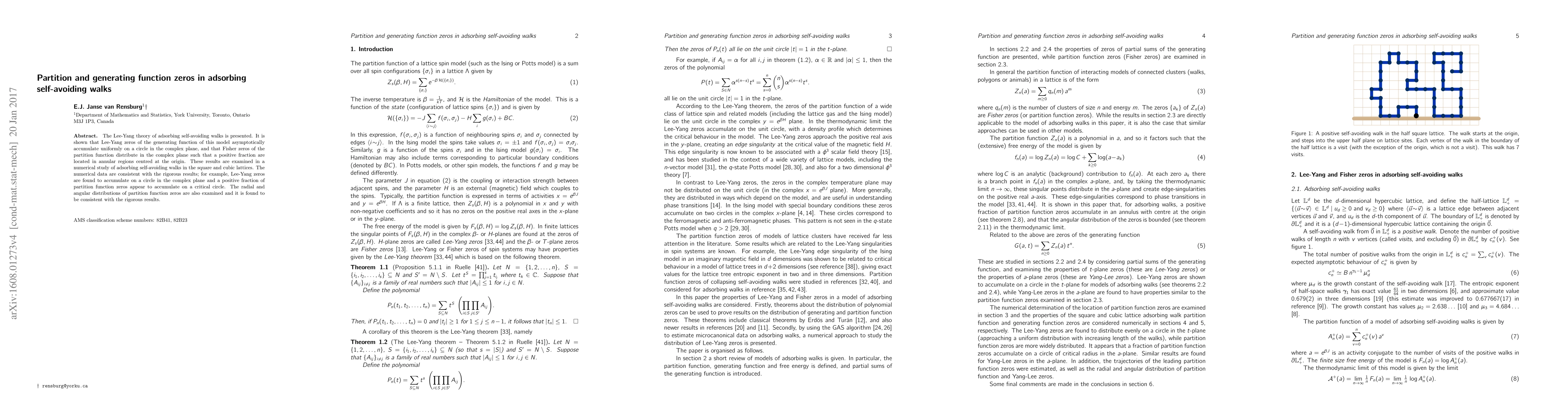 This paper explores the Lee-Yang and Fisher zeros in the generating function and partition function of adsorbing self-avoiding walks, demonstrating their asymptotic distribution patterns. Numerical studies on square and cubic lattices confirm these patterns, showing Lee-Yang zeros on a circle and Fisher zeros in annular regions around the origin.