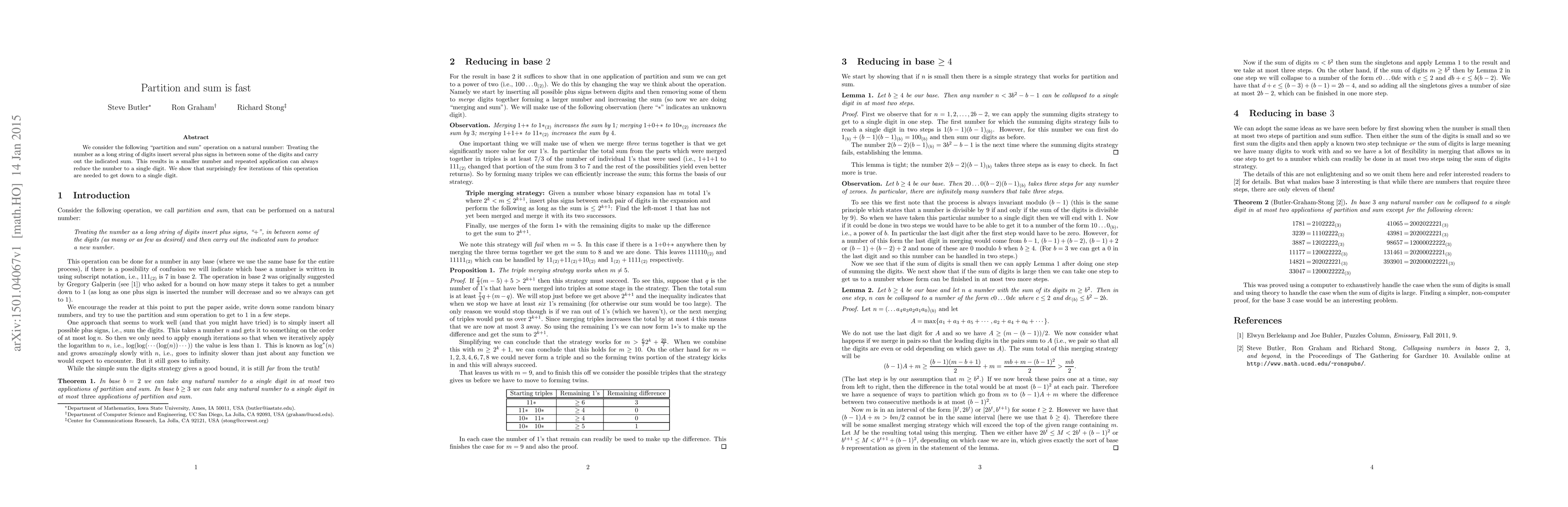 We consider the following "partition and sum" operation on a natural number: Treating the number as a long string of digits insert several plus signs in between some of the digits and carry out the indicated sum. This results in a smaller number and repeated application can always reduce the number to a single digit. We show that surprisingly few iterations of this operation are needed to get down to a single digit.
