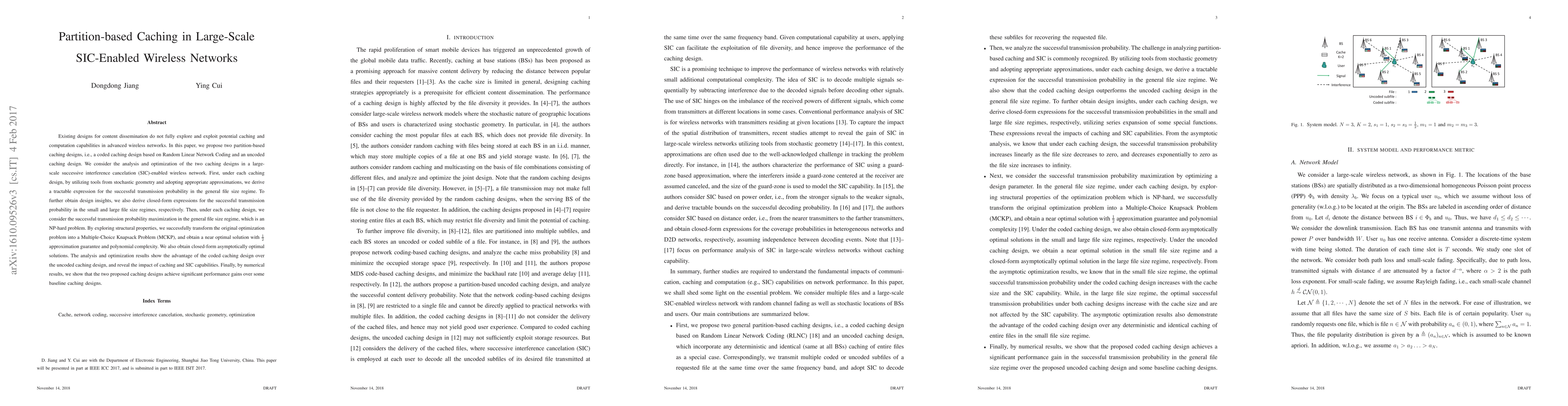 Existing designs for content dissemination do not fully explore and exploit potential caching and computation capabilities in advanced wireless networks. In this paper, we propose two partition-based caching designs, i.e., a coded caching design based on Random Linear Network Coding and an uncoded caching design. We consider the analysis and optimization of the two caching designs in a large-scale successive interference cancelation (SIC)-enabled wireless network. First, under each caching design, by utilizing tools from stochastic geometry and adopting appropriate approximations, we derive a tractable expression for the successful transmission probability in the general file size regime. To further obtain design insights, we also derive closed-form expressions for the successful transmission probability in the small and large file size regimes, respectively. Then, under each caching design, we consider the successful transmission probability maximization in the general file size regime, which is an NP-hard problem. By exploring structural properties, we successfully transform the original optimization problem into a Multiple-Choice Knapsack Problem (MCKP), and obtain a near optimal solution with 1/2 approximation guarantee and polynomial complexity. We also obtain closed-form asymptotically optimal solutions. The analysis and optimization results show the advantage of the coded caching design over the uncoded caching design, and reveal the impact of caching and SIC capabilities. Finally, by numerical results, we show that the two proposed caching designs achieve significant performance gains over some baseline caching designs.