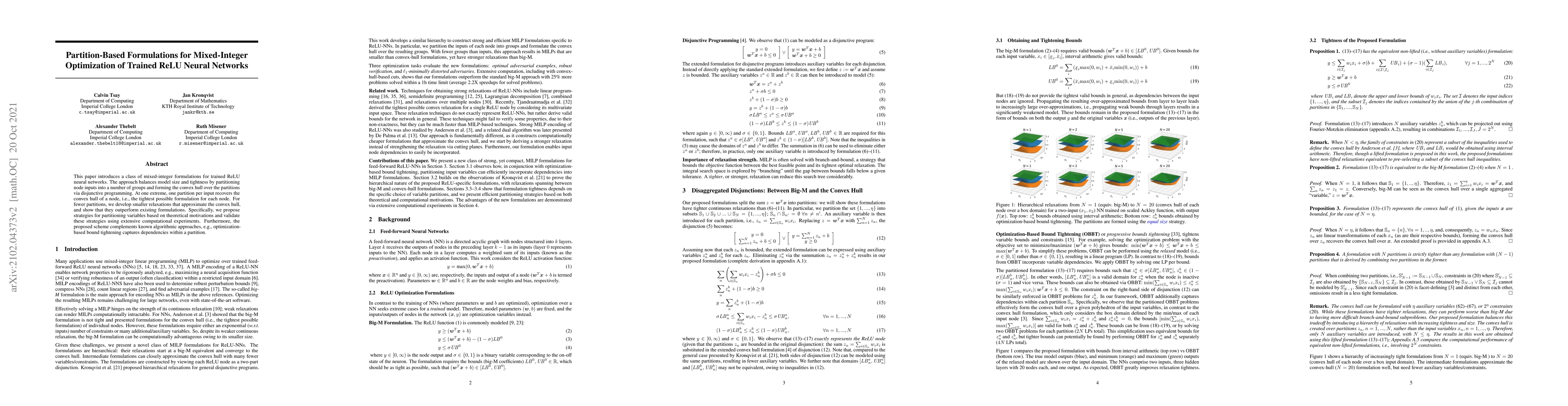 This paper proposes mixed-integer formulations for optimizing trained ReLU neural networks by partitioning node inputs into groups and forming convex hulls via disjunctive programming. The approach balances model size and tightness, showing improved performance over existing formulations through extensive computational experiments.