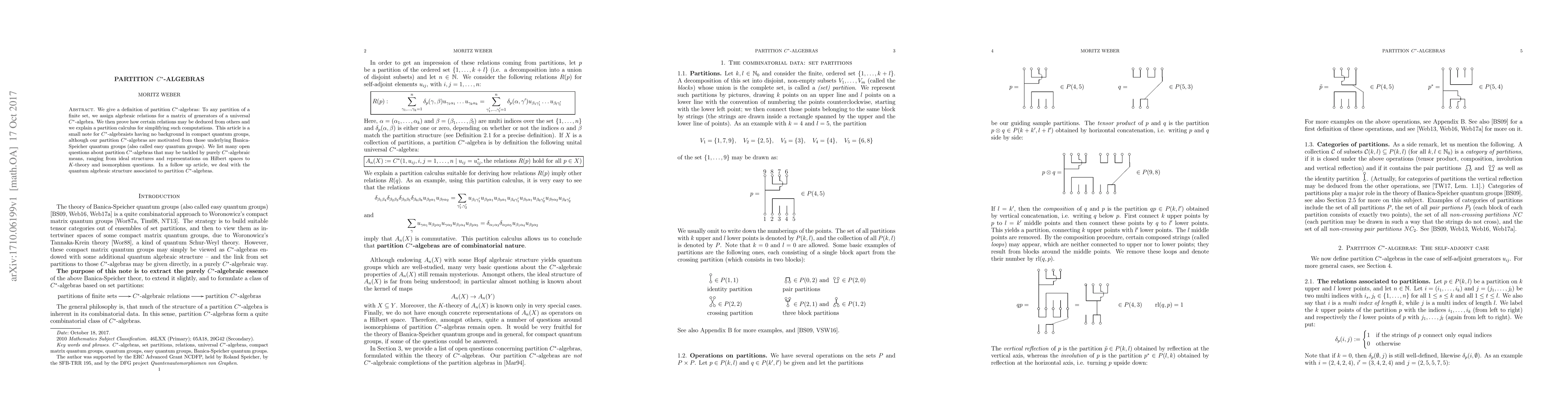 This paper defines partition C*-algebras, assigning algebraic relations to partitions of a finite set, and introduces a calculus for simplifying computations. It aims to serve C*-algebraists without background in quantum groups and outlines numerous open questions for future exploration.