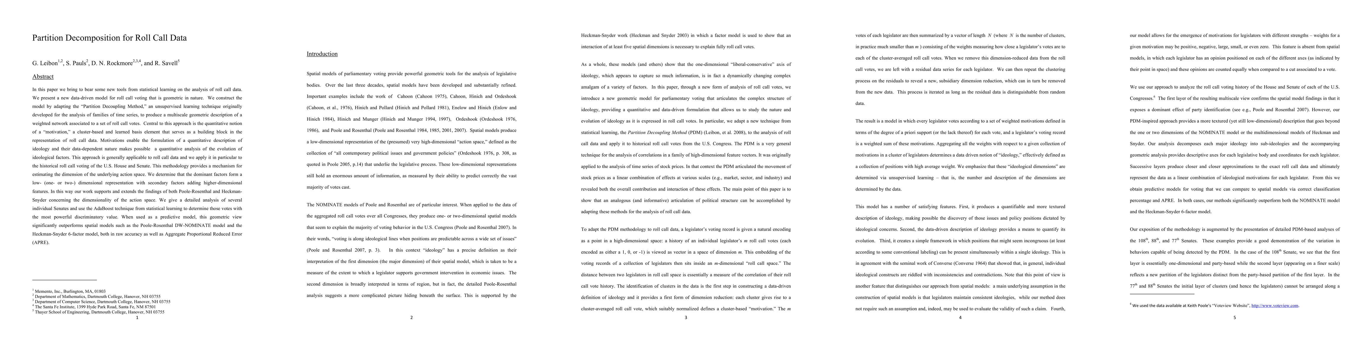 In this paper we bring to bear some new tools from statistical learning on the analysis of roll call data. We present a new data-driven model for roll call voting that is geometric in nature. We construct the model by adapting the "Partition Decoupling Method," an unsupervised learning technique originally developed for the analysis of families of time series, to produce a multiscale geometric description of a weighted network associated to a set of roll call votes. Central to this approach is the quantitative notion of a "motivation," a cluster-based and learned basis element that serves as a building block in the representation of roll call data. Motivations enable the formulation of a quantitative description of ideology and their data-dependent nature makes possible a quantitative analysis of the evolution of ideological factors. This approach is generally applicable to roll call data and we apply it in particular to the historical roll call voting of the U.S. House and Senate. This methodology provides a mechanism for estimating the dimension of the underlying action space. We determine that the dominant factors form a low- (one- or two-) dimensional representation with secondary factors adding higher-dimensional features. In this way our work supports and extends the findings of both Poole-Rosenthal and Heckman-Snyder concerning the dimensionality of the action space. We give a detailed analysis of several individual Senates and use the AdaBoost technique from statistical learning to determine those votes with the most powerful discriminatory value. When used as a predictive model, this geometric view significantly outperforms spatial models such as the Poole-Rosenthal DW-NOMINATE model and the Heckman-Snyder 6-factor model, both in raw accuracy as well as Aggregate Proportional Reduced Error (APRE).