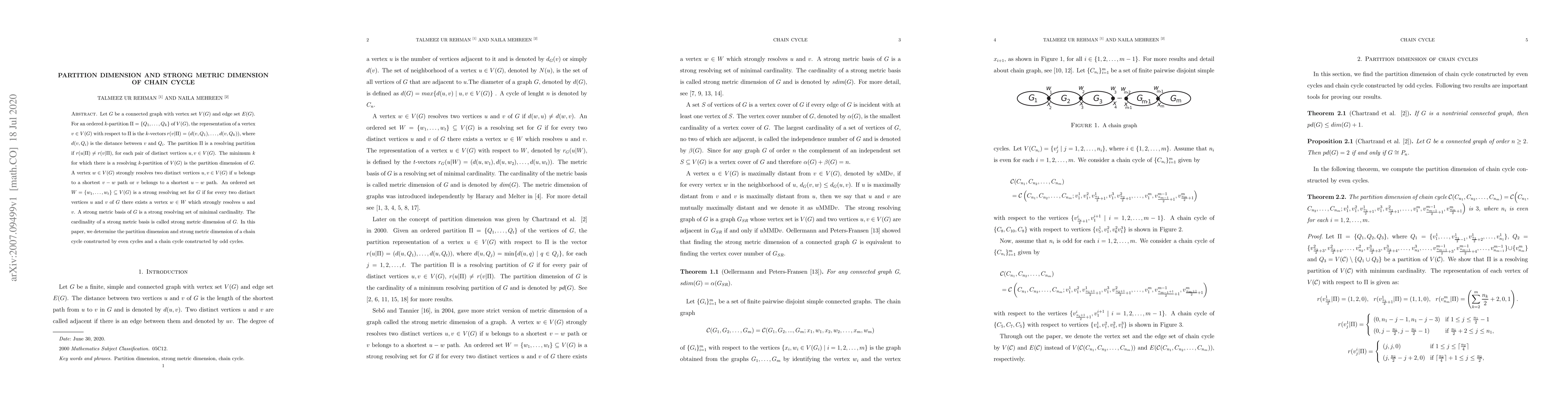 Let $G$ be a connected graph with vertex set $V(G)$ and edge set $E(G)$. For an ordered $k$-partition $\Pi=\{Q_1,\ldots,Q_k\}$ of $V(G)$, the representation of a vertex $v \in V(G)$ with respect to $\Pi$ is the $k$-vectors $r(v|\Pi)=(d(v,Q_1),\ldots,d(v,Q_k))$, where $d(v,Q_i)$ is the distance between $v$ and $Q_i$. The partition $\Pi$ is a resolving partition if $r(u|\Pi)\neq r(v|\Pi)$, for each pair of distinct vertices $u,v \in V(G)$. The minimum $k$ for which there is a resolving $k$-partition of $V(G)$ is the partition dimension of $G$. A vertex $w\in V(G)$ strongly resolves two distinct vertices $u,v \in V(G)$ if $u$ belongs to a shortest $v-w$ path or $v$ belongs to a shortest $u-w$ path. An ordered set $W=\{w_{1},\ldots, w_{t}\}\subseteq V(G)$ is a strong resolving set for $G$ if for every two distinct vertices $u$ and $v$ of $G$ there exists a vertex $w\in W$ which strongly resolves $u$ and $v$. A strong metric basis of $G$ is a strong resolving set of minimal cardinality. The cardinality of a strong metric basis is called strong metric dimension of $G$. In this paper, we determine the partition dimension and strong metric dimension of a chain cycle constructed by even cycles and a chain cycle constructed by odd cycles.