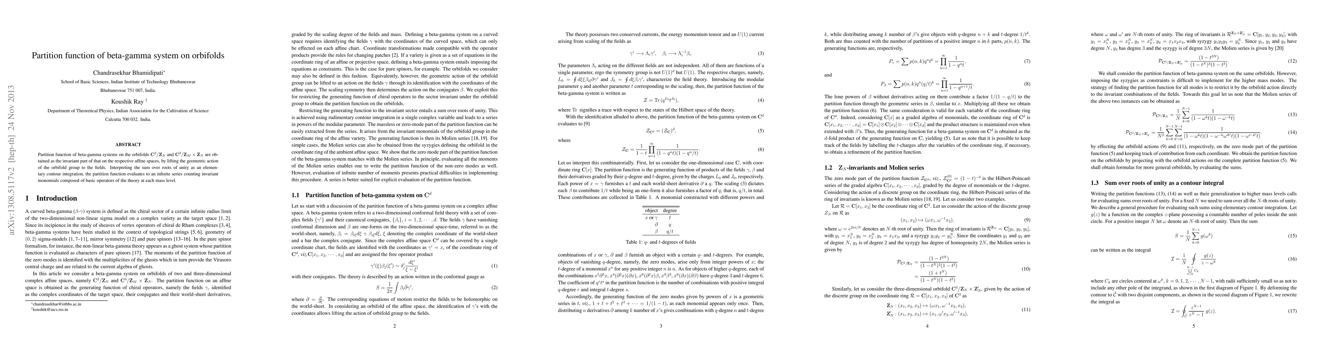 Partition function of beta-gamma systems on the orbifolds C^2/Z_N and C^3/Z_M x Z_N are obtained as the invariant part of that on the respective affine spaces, by lifting the geometric action of the orbifold group to the fields. Interpreting the sum over roots of unity as an elementary contour integration, the partition function evaluates to an infinite series counting invariant monomials composed of basic operators of the theory at each mass level.