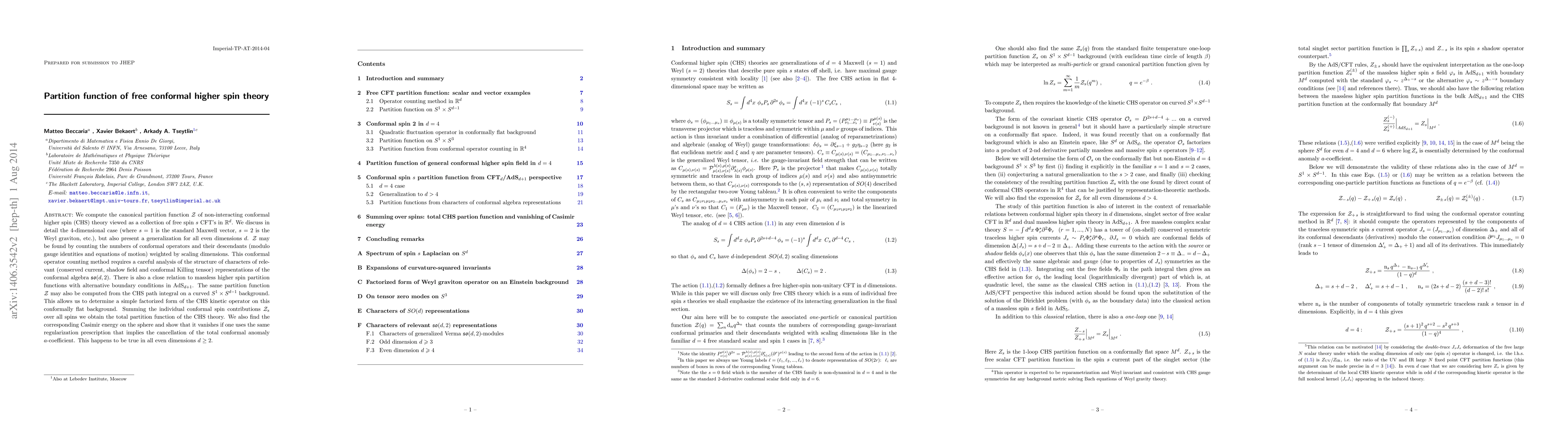 This paper computes the partition function of free conformal higher spin theory by counting conformal operators and their descendants, analyzing representations of the conformal algebra, and deriving a factorized form of the CHS kinetic operator. The Casimir energy is found to vanish in all even dimensions, consistent with the cancellation of the conformal anomaly.