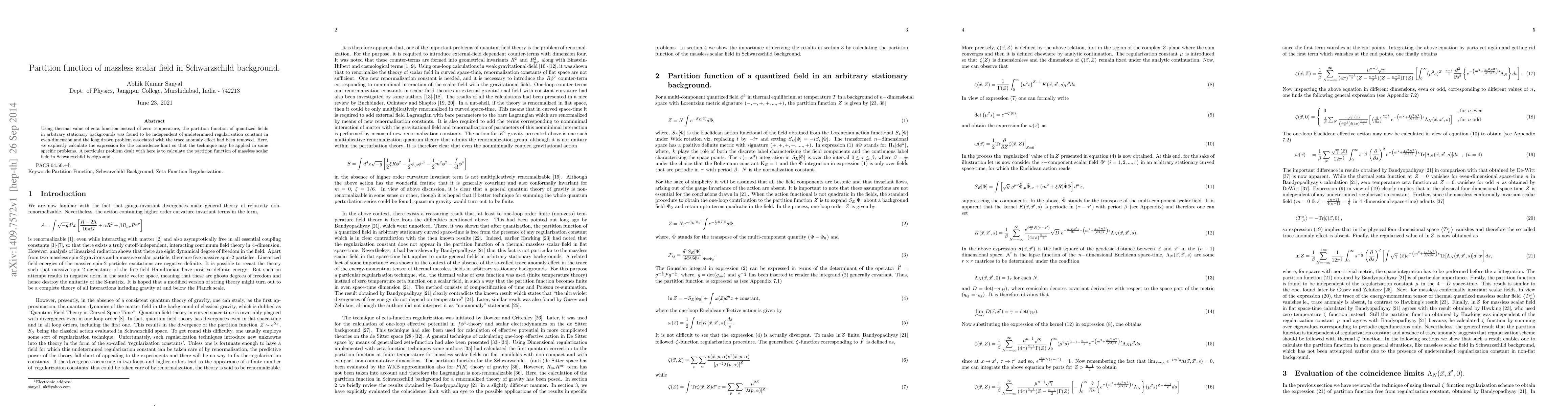 Using thermal value of zeta function instead of zero temperature, the partition function of quantized fields in arbitrary stationary backgrounds was found to be independent of undetermined regularization constant in even-dimension and the long drawn problem associated with the trace anomaly effect had been removed. Here, we explicitly calculate the expression for the coincidence limit so that the technique may be applied in some specific problems. A particular problem dealt with here is to calculate the partition function of massless scalar field in Schwarzschild background.