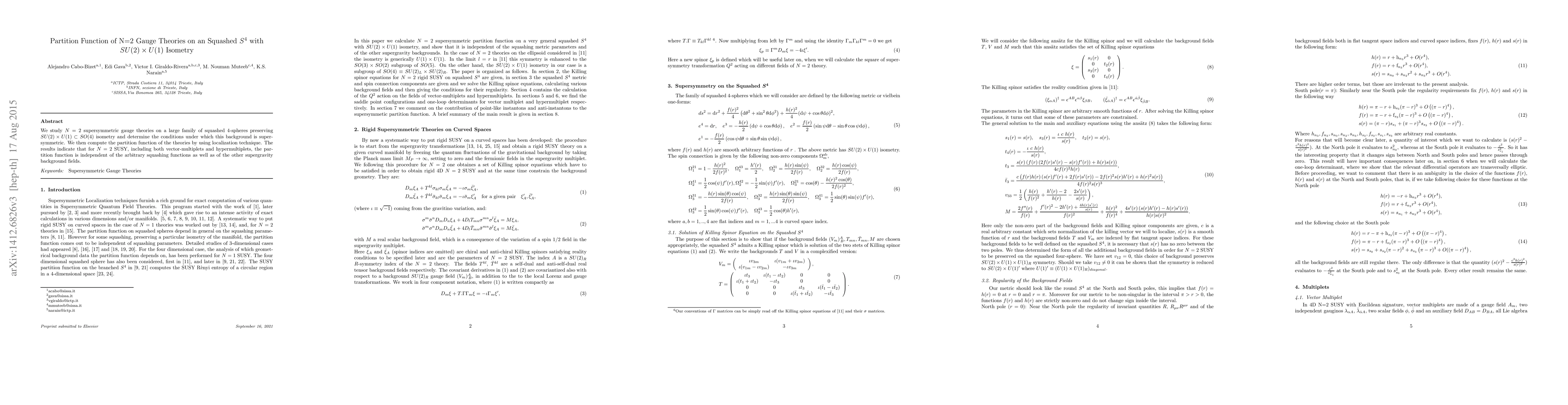 This paper investigates $N=2$ supersymmetric gauge theories on squashed $S^4$ spaces maintaining $SU(2)\times U(1)$ isometry, determining supersymmetric conditions and computing the partition function using localization techniques, revealing independence from squashing functions and background fields.