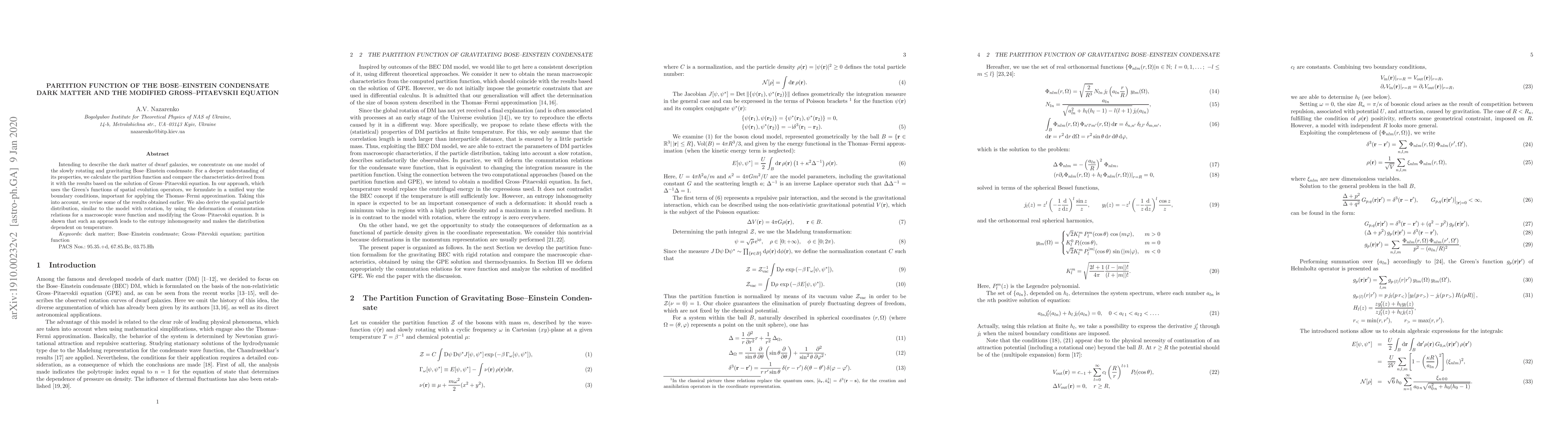 Researchers study a Bose-Einstein condensate model of dark matter in dwarf galaxies, calculating its partition function to better understand its properties and compare with the Gross-Pitaevskii equation results.