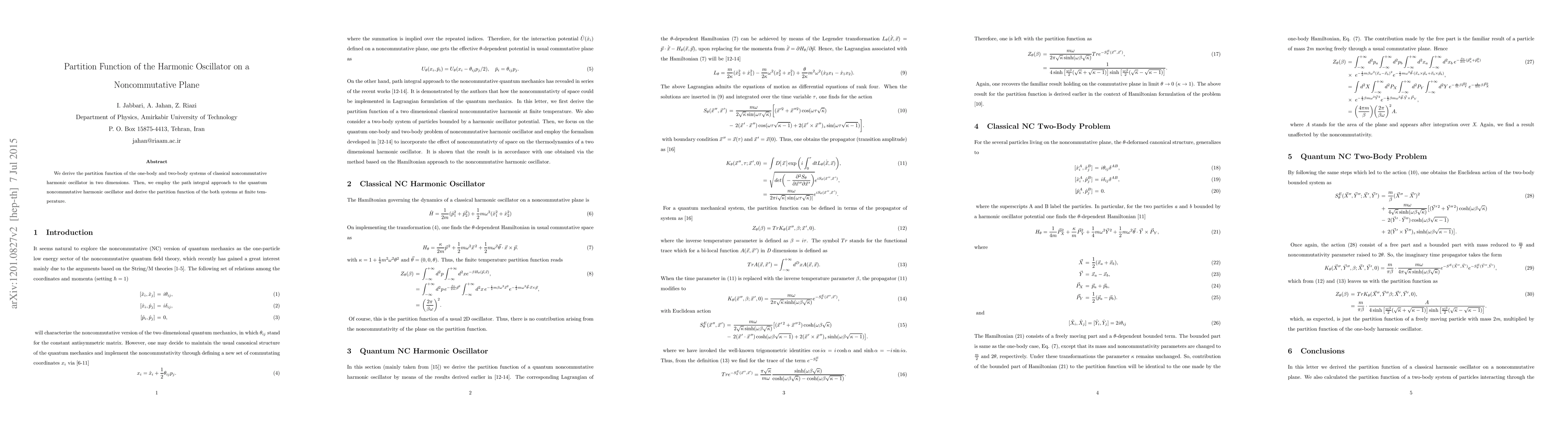 This paper derives the partition functions for one-body and two-body systems of the classical noncommutative harmonic oscillator in two dimensions and extends the analysis to the quantum realm using a path integral approach, obtaining the partition functions at finite temperature.