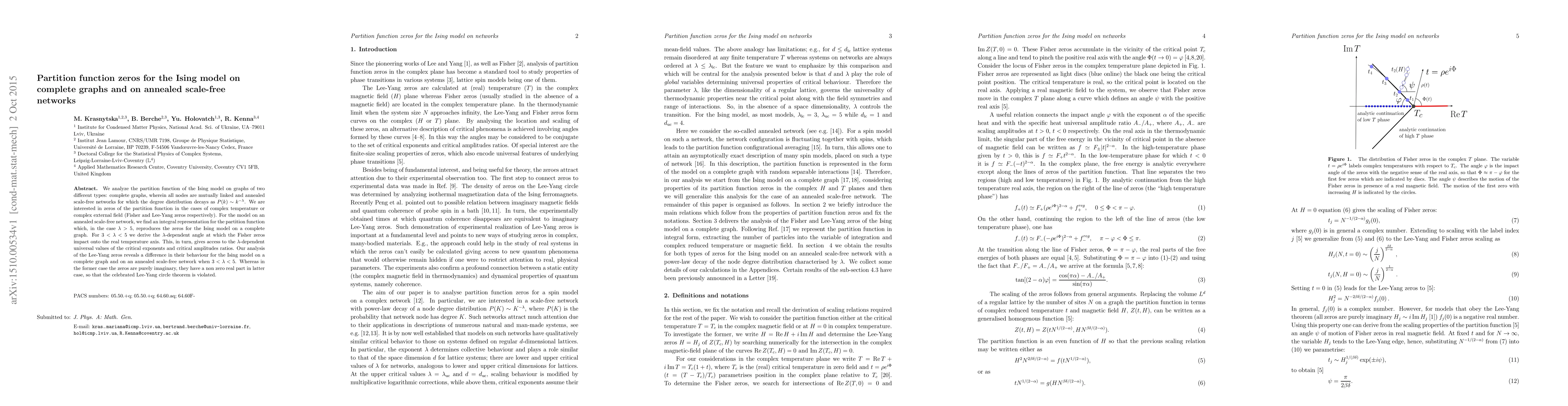 We analyze the partition function of the Ising model on graphs of two different types: complete graphs, wherein all nodes are mutually linked and annealed scale-free networks for which the degree distribution decays as $P(k)\sim k^{-\lambda}$. We are interested in zeros of the partition function in the cases of complex temperature or complex external field (Fisher and Lee-Yang zeros respectively). For the model on an annealed scale-free network, we find an integral representation for the partition function which, in the case $\lambda > 5$, reproduces the zeros for the Ising model on a complete graph. For $3<\lambda < 5$ we derive the $\lambda$-dependent angle at which the Fisher zeros impact onto the real temperature axis. This, in turn, gives access to the $\lambda$-dependent universal values of the critical exponents and critical amplitudes ratios. Our analysis of the Lee-Yang zeros reveals a difference in their behaviour for the Ising model on a complete graph and on an annealed scale-free network when $3<\lambda <5$. Whereas in the former case the zeros are purely imaginary, they have a non zero real part in latter case, so that the celebrated Lee-Yang circle theorem is violated.