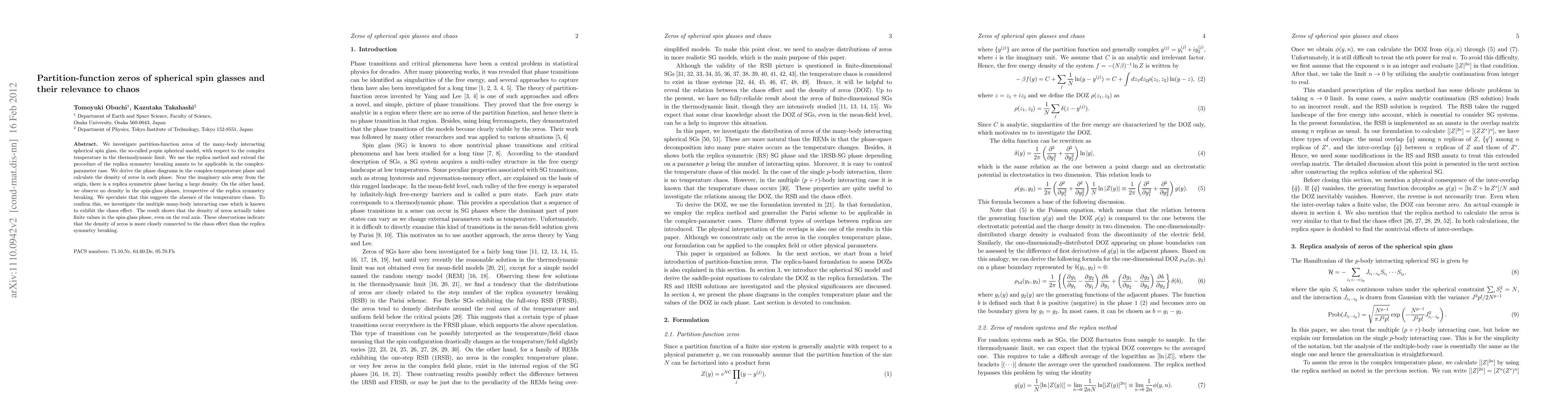 This paper investigates partition-function zeros in the $p$-spin spherical spin glass model, finding a high density near the imaginary axis but none in spin-glass phases, suggesting the absence of temperature chaos. It contrasts this with chaotic systems, showing finite zero density in spin-glass phases, indicating a closer link between zero density and chaos than replica symmetry breaking.