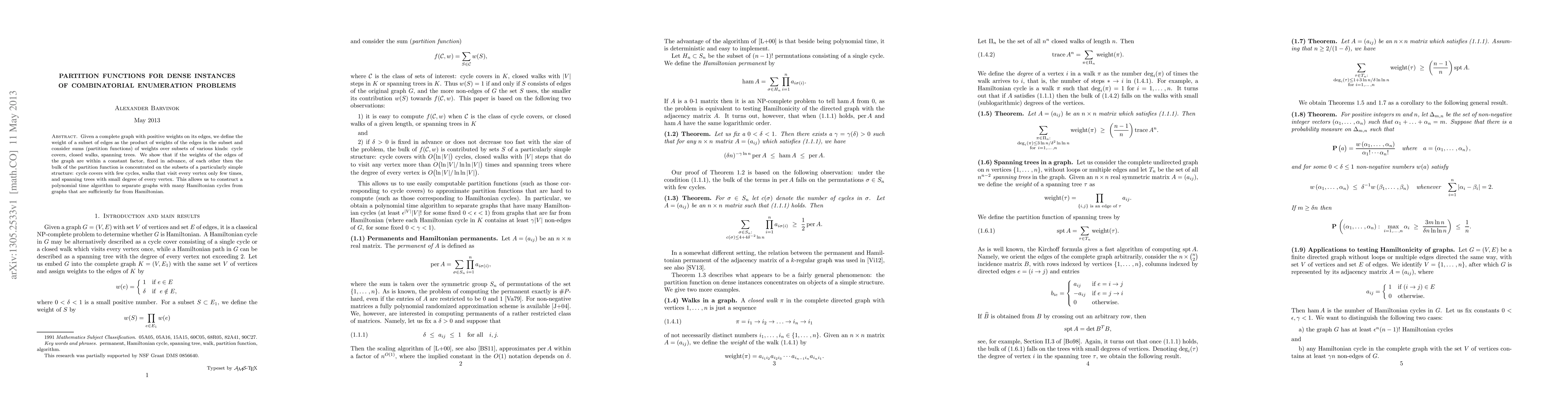 Given a complete graph with positive weights on its edges, we define the weight of a subset of edges as the product of weights of the edges in the subset and consider sums (partition functions) of weights over subsets of various kinds: cycle covers, closed walks, spanning trees. We show that if the weights of the edges of the graph are within a constant factor, fixed in advance, of each other then the bulk of the partition function is concentrated on the subsets of a particularly simple structure: cycle covers with few cycles, walks that visit every vertex only few times, and spanning trees with small degree of every vertex. This allows us to construct a polynomial time algorithm to separate graphs with many Hamiltonian cycles from graphs that are sufficiently far from Hamiltonian.